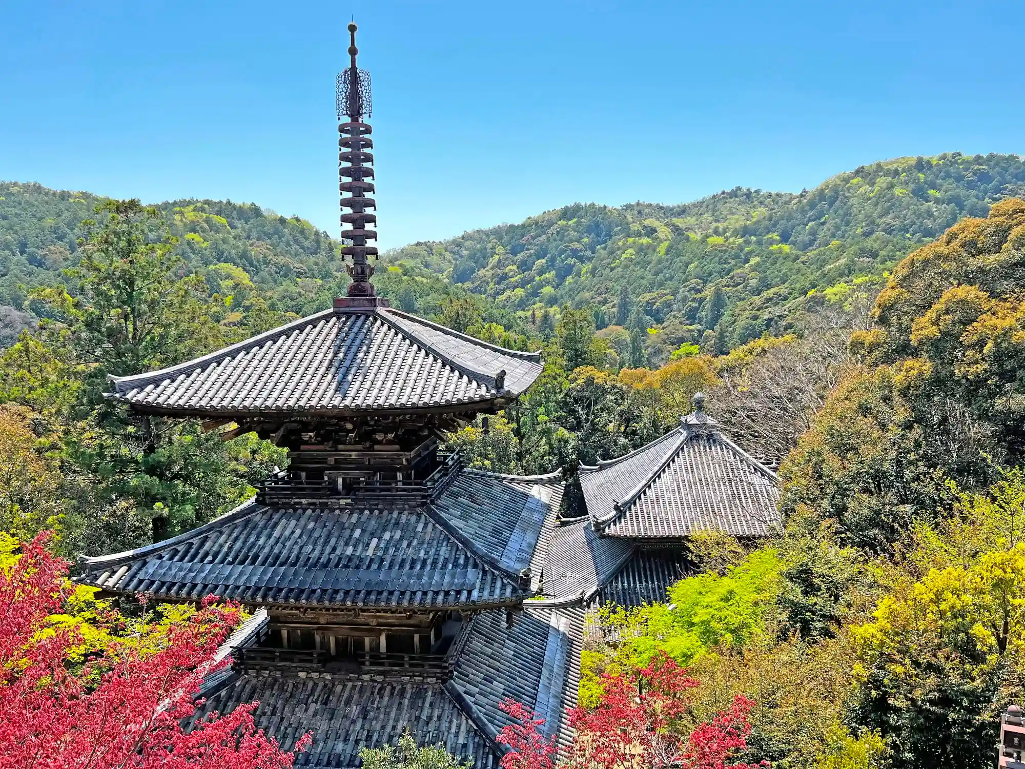 本堂南東端から見た、国宝<三重塔>。