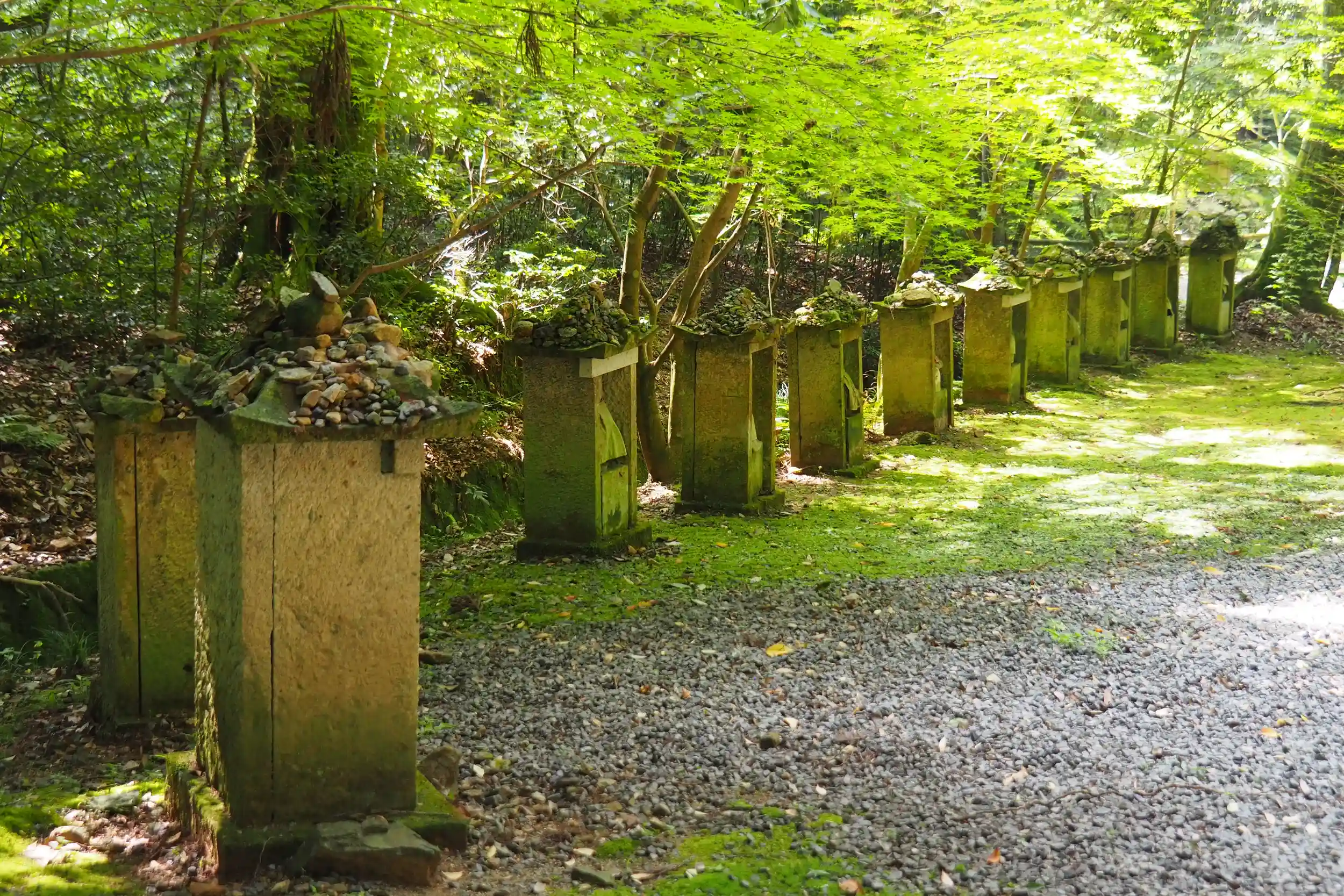 帰りは本堂へは戻らずに駐車場方面へ。苔むした石像が並びます。