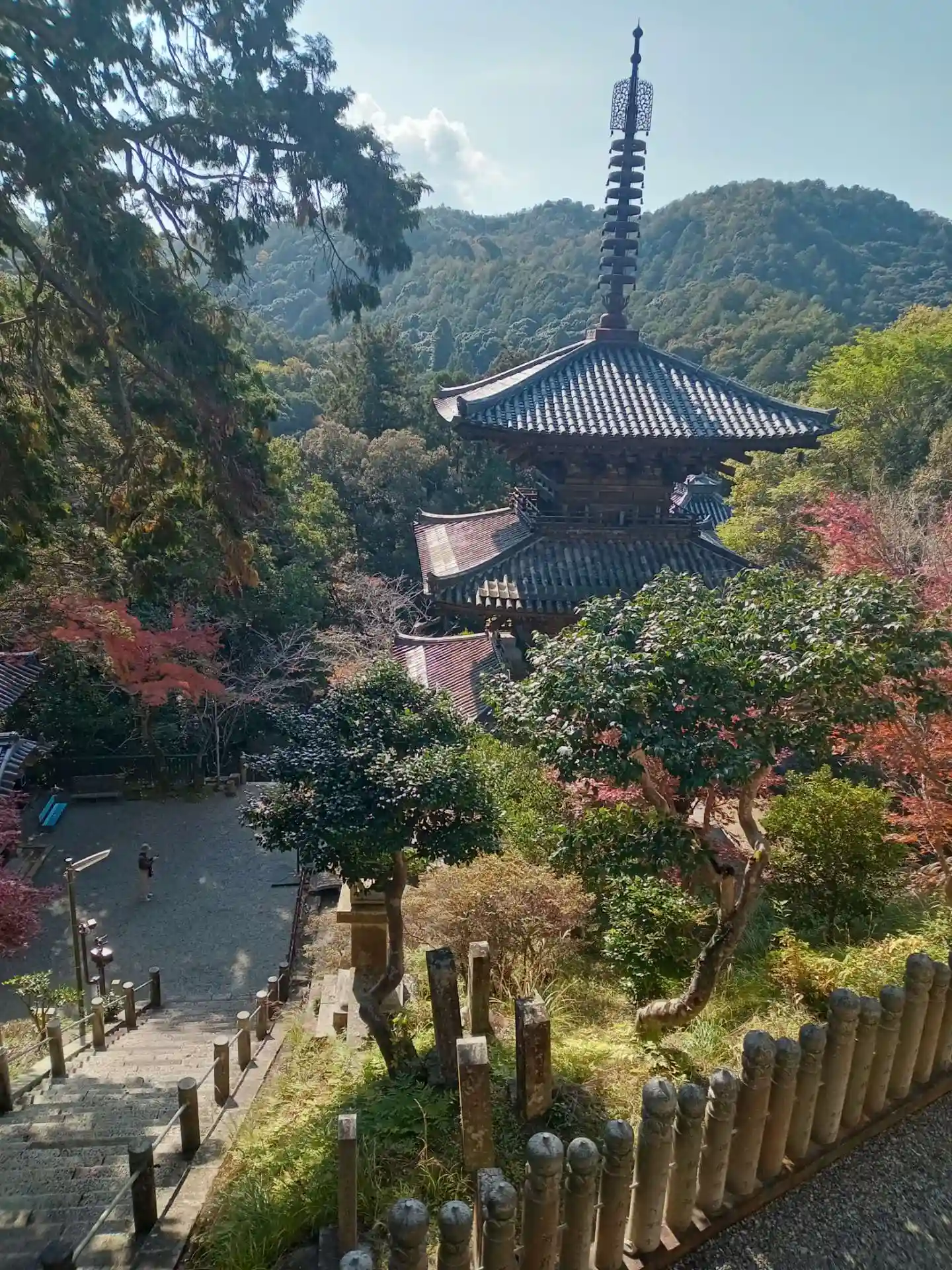 長く急な階段の先に重要文化財の三重塔、そして本堂。本堂を過…