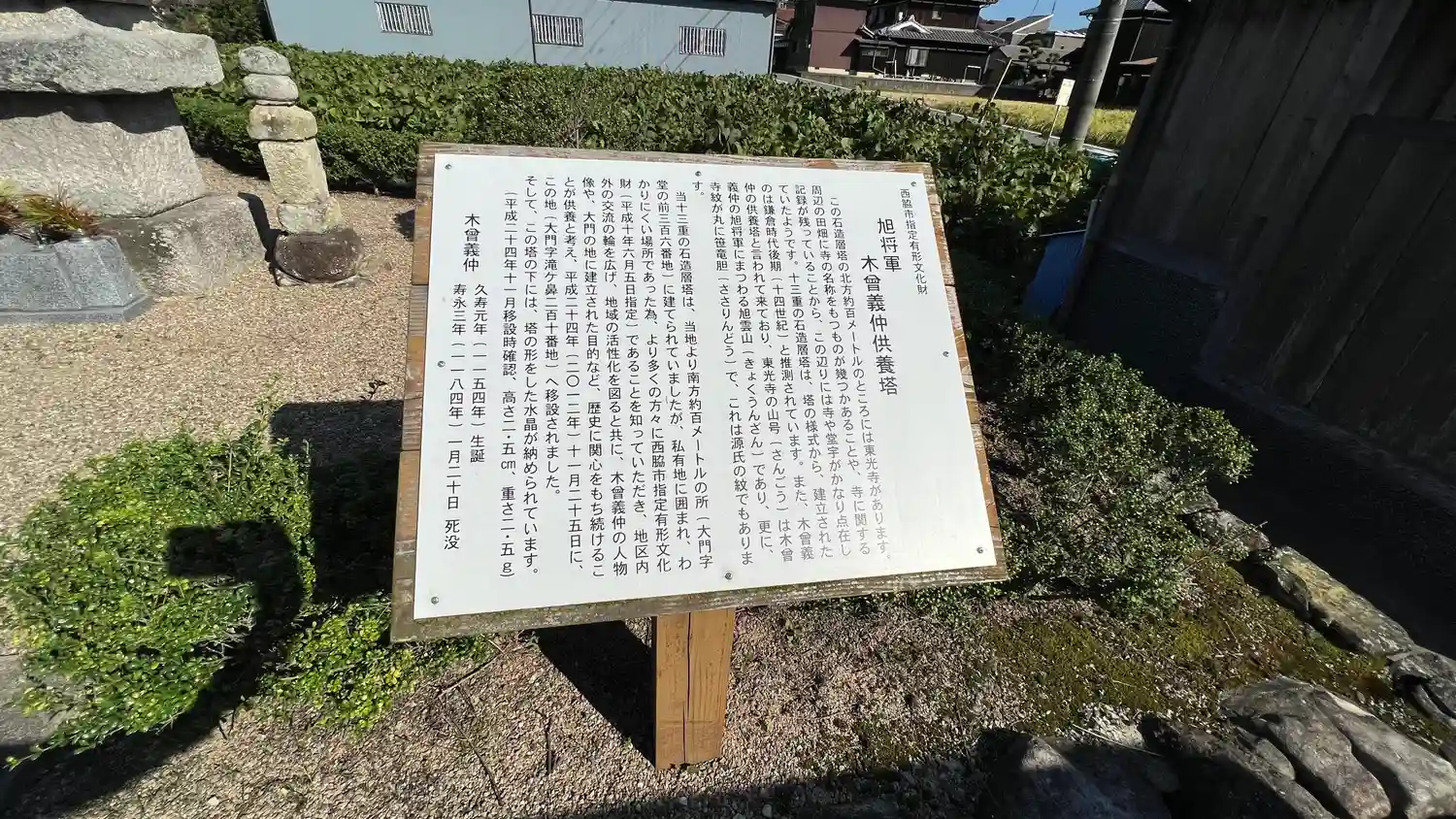 お寺より南に数メートルのところにある十三重の塔は「木曾義仲供養塔」と伝わる。こっちも案内板あり。