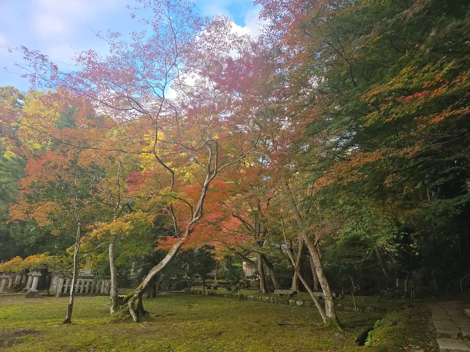 鶴亀の庭への道の灯台躑躅が色づき御本堂から