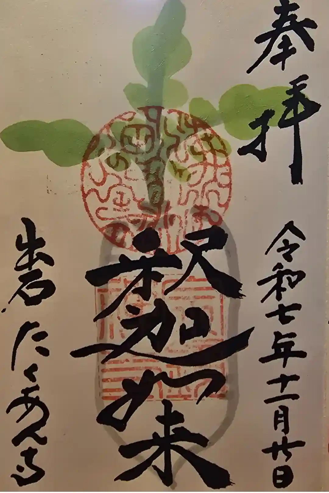 沢庵漬けの大根をモチーフにしたユニークな御朱印です。