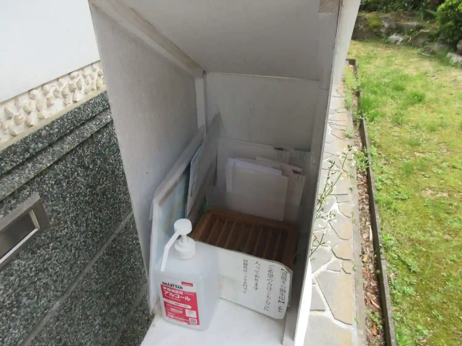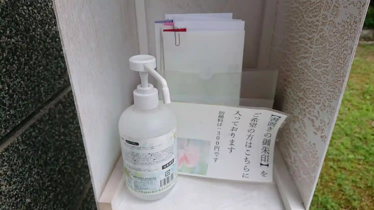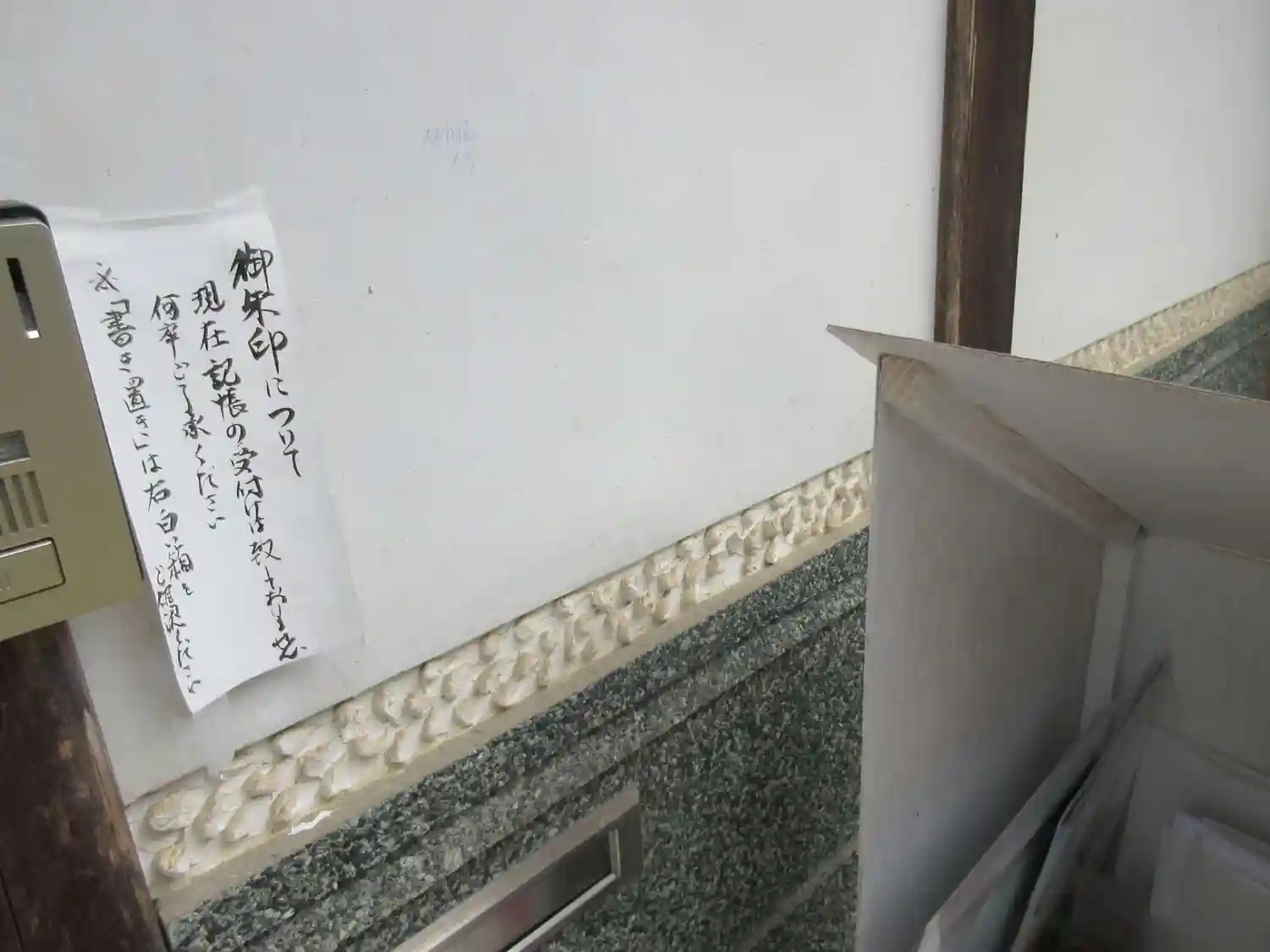 神社向かいの宮司様宅の玄関前に書き置きがありました