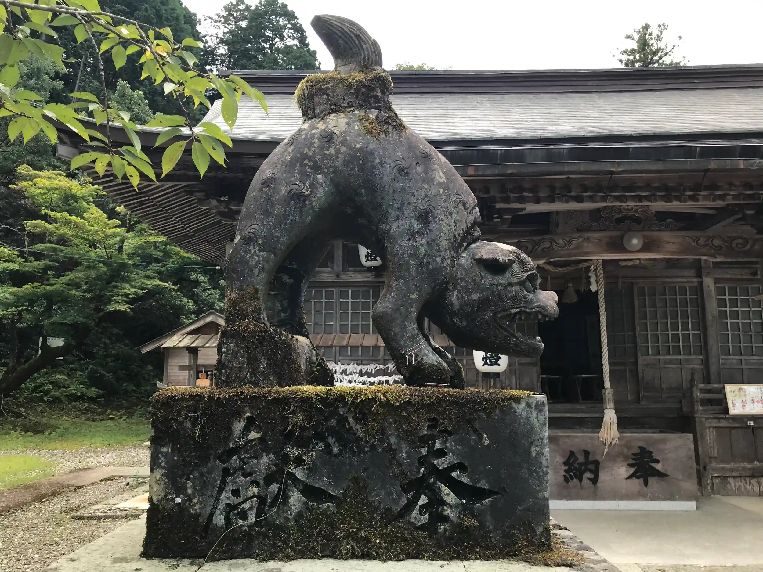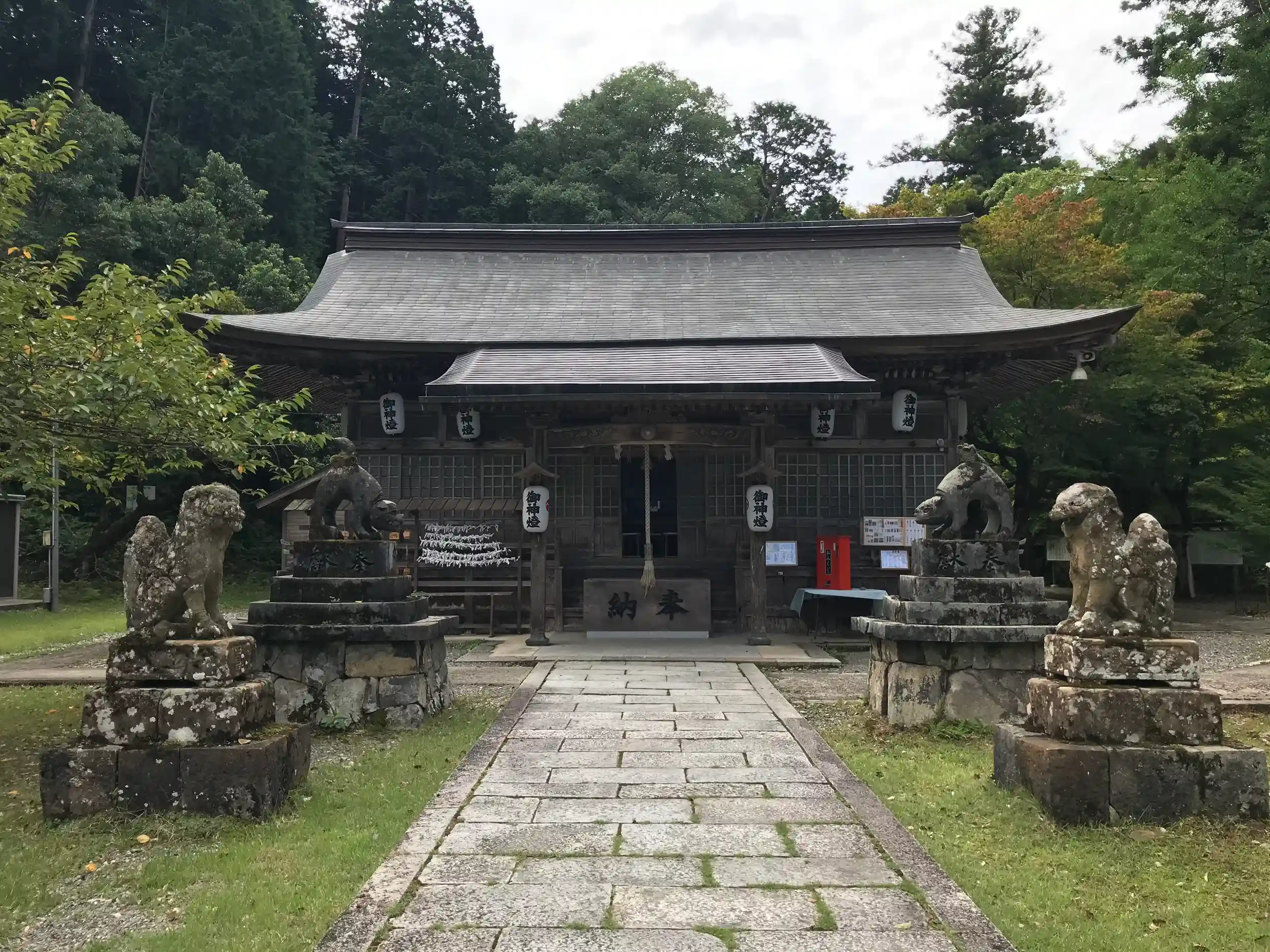 拝殿の前には狛犬と狼像が建っている。