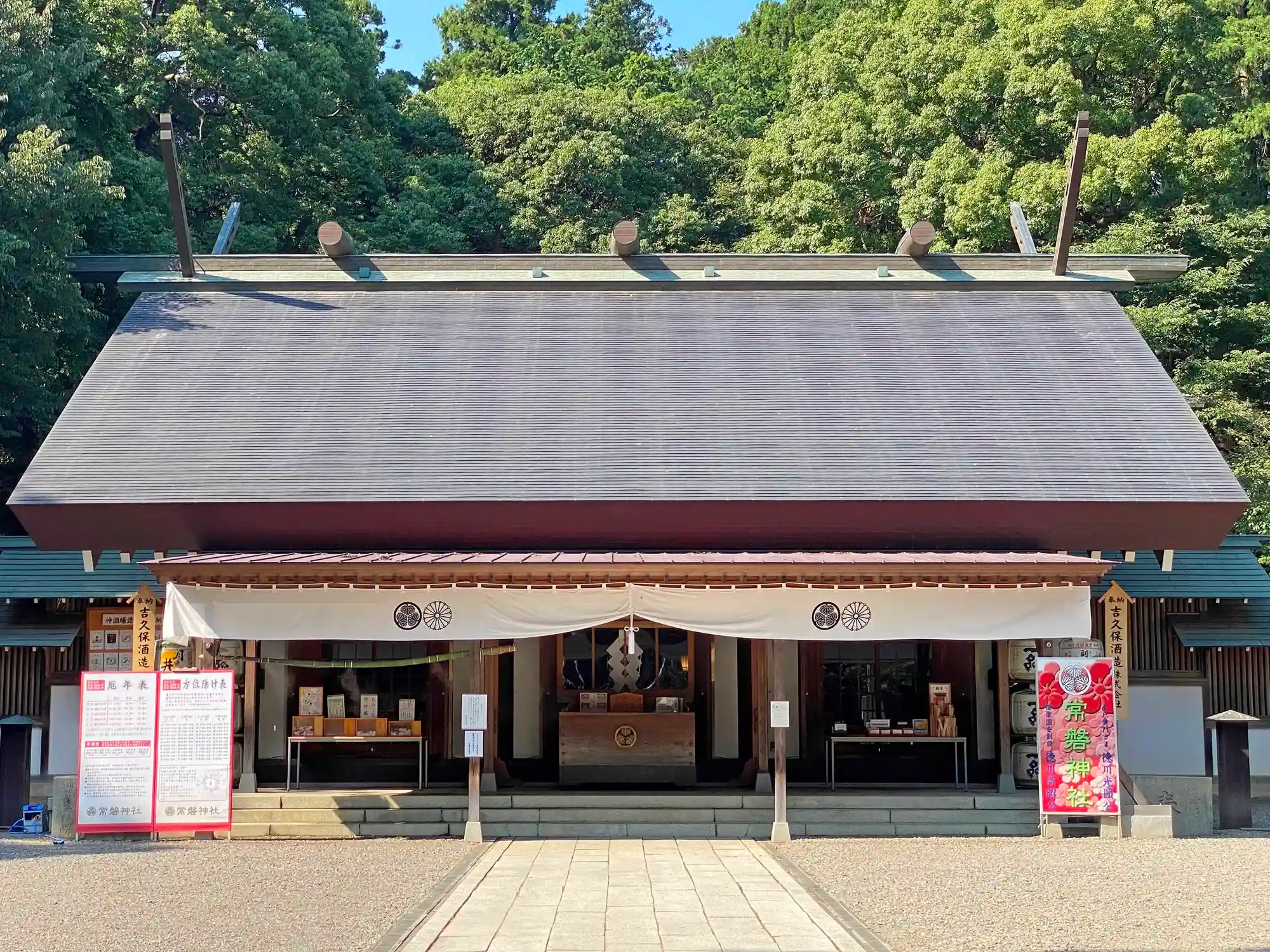 当社は、JR常磐線・偕楽園駅の北200mほどの、偕楽園の東側にある。敷地東側の有料駐車場にある鳥居から入ると、境内は広々としていて、空間を贅沢に使い、大きな社殿がポツンと建っている。