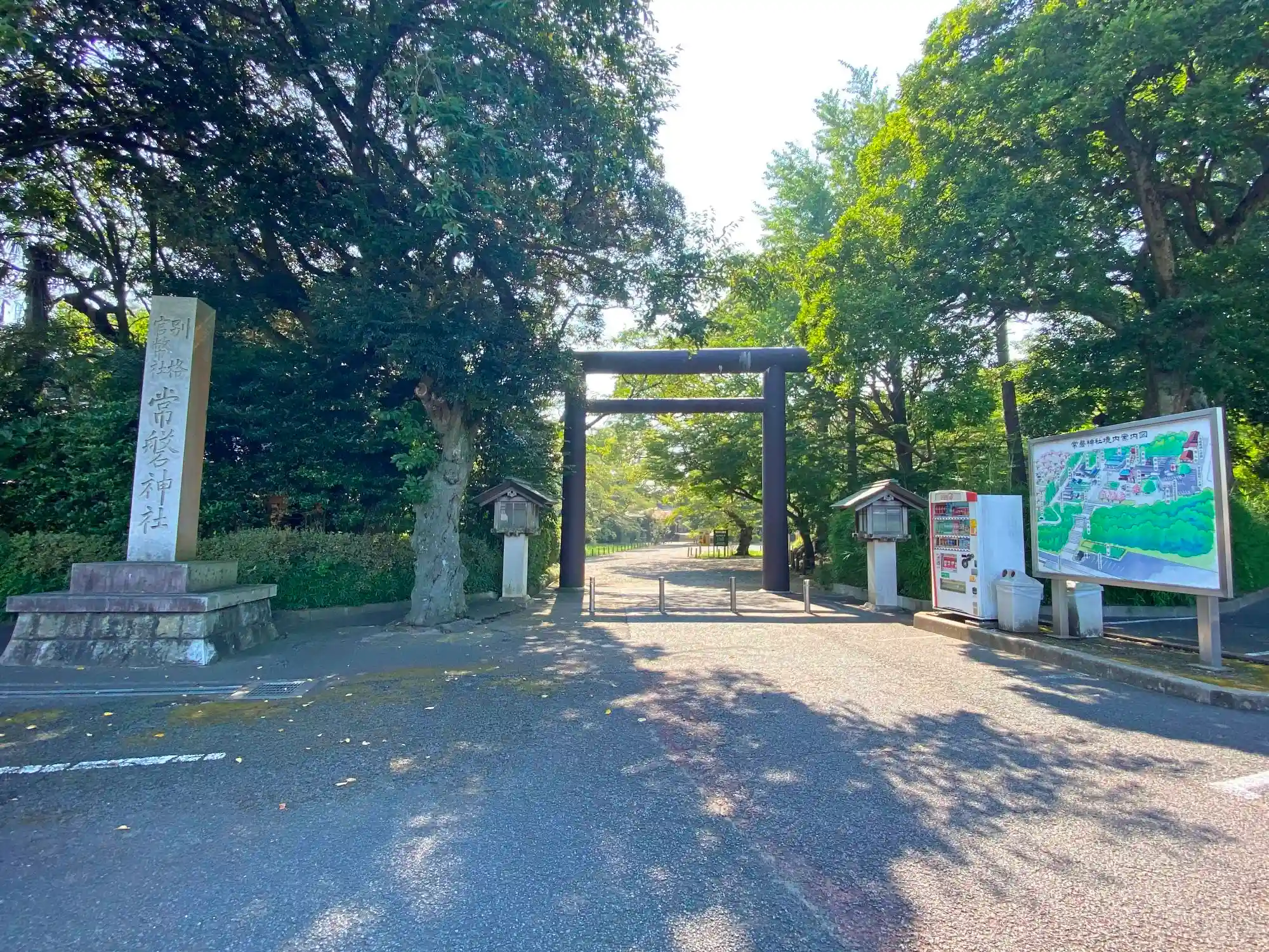 境内入口の<東鳥居>と<社号標>。当社は<水戸偕楽園>の東端にあり、<常盤神社駐車場>にあるこの鳥居は東向きに立っている。 ※境内の南方には偕楽園駐車場と当社の大鳥居がある。