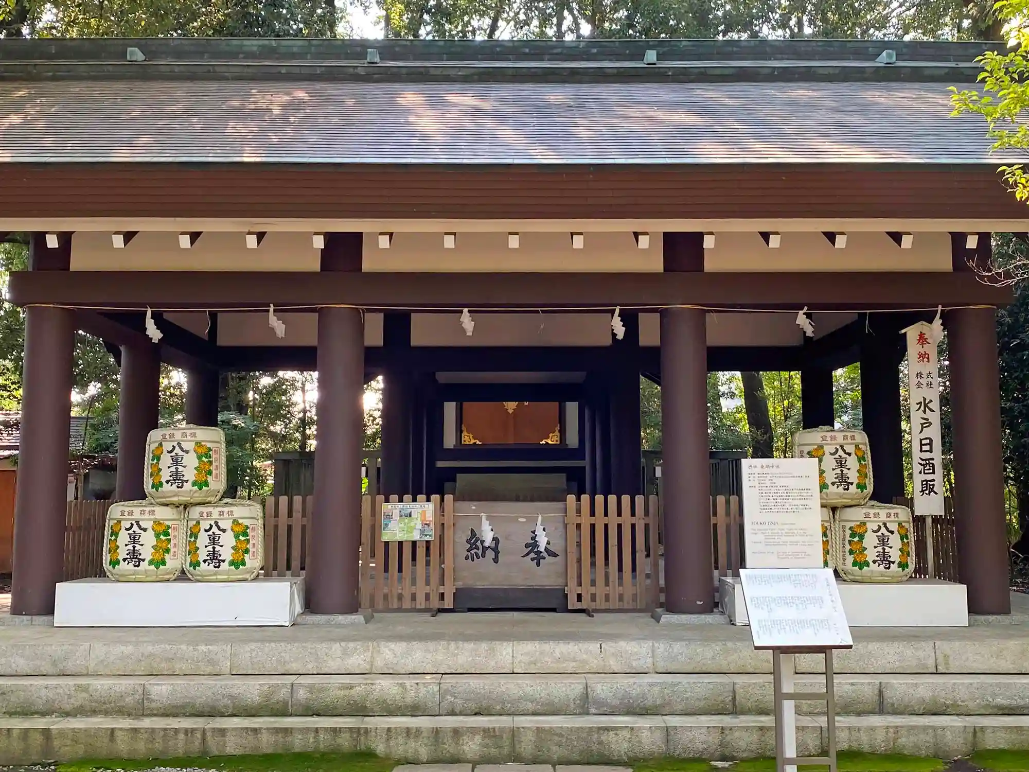 <東湖神社>の社殿正面。拝殿の両側奥が抜けていて、偕楽園が<借景>のようになっている。