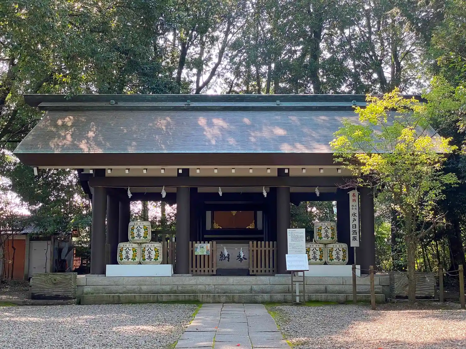 <東湖神社>の社殿正面。拝殿の両側奥が抜けていて、偕楽園が<借景>のようになっている。