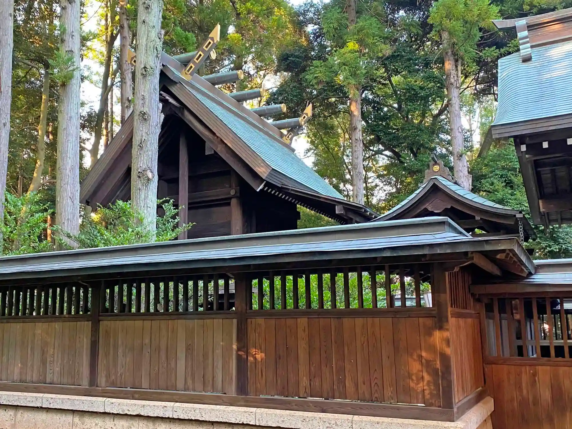社殿の左側から見た<本殿>。神明造銅板葺。写真右側に<中門>が見える。