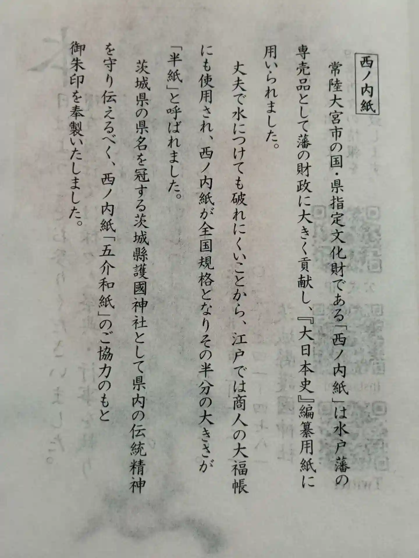 常陸大宮市の国・県指定文化財である「西ノ内紙」は水戸藩の専売品として藩の財政に大きく貢献し、『大日本史』編集用に用いられました。