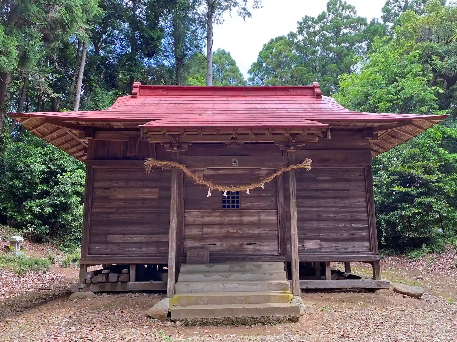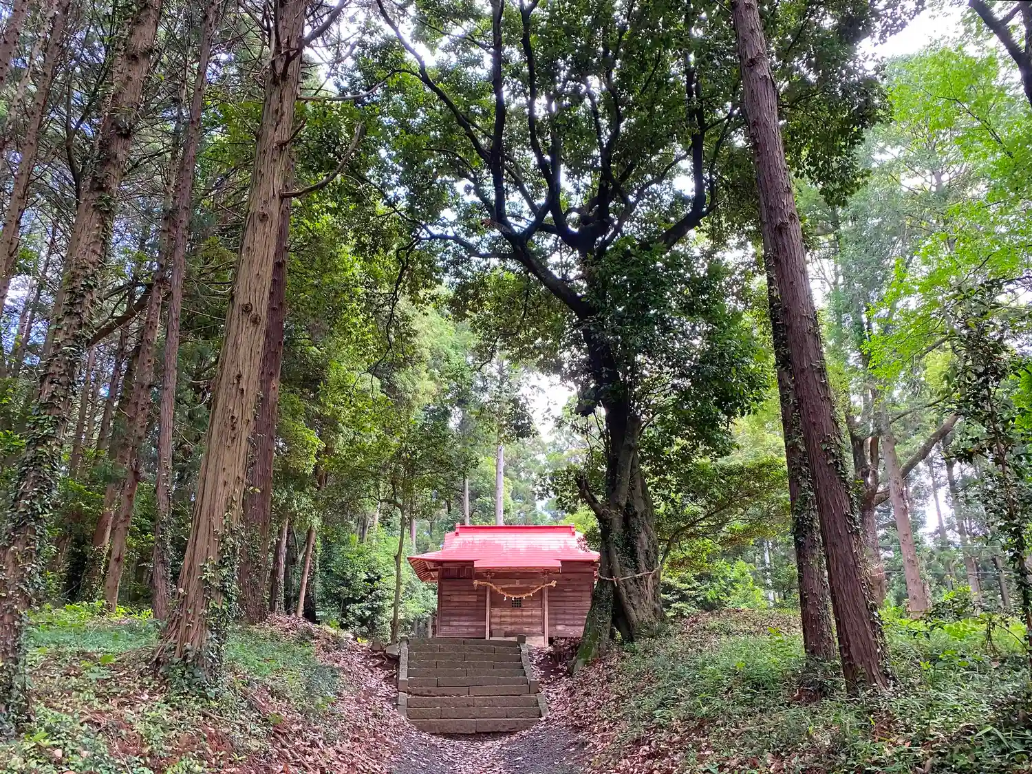 当社は、JR常磐線・内原駅の北方5kmのなだらかな丘陵地の林の中にある。クルマだと常磐道・水戸ICから北西に4km。境内はさほど広くはなく、林の中之ちょっとした参道と、一段上がった境内地に社殿と小さな石祠のみ。古木も1本のみなので、ほとんど式内社らしさは感じられなかった。