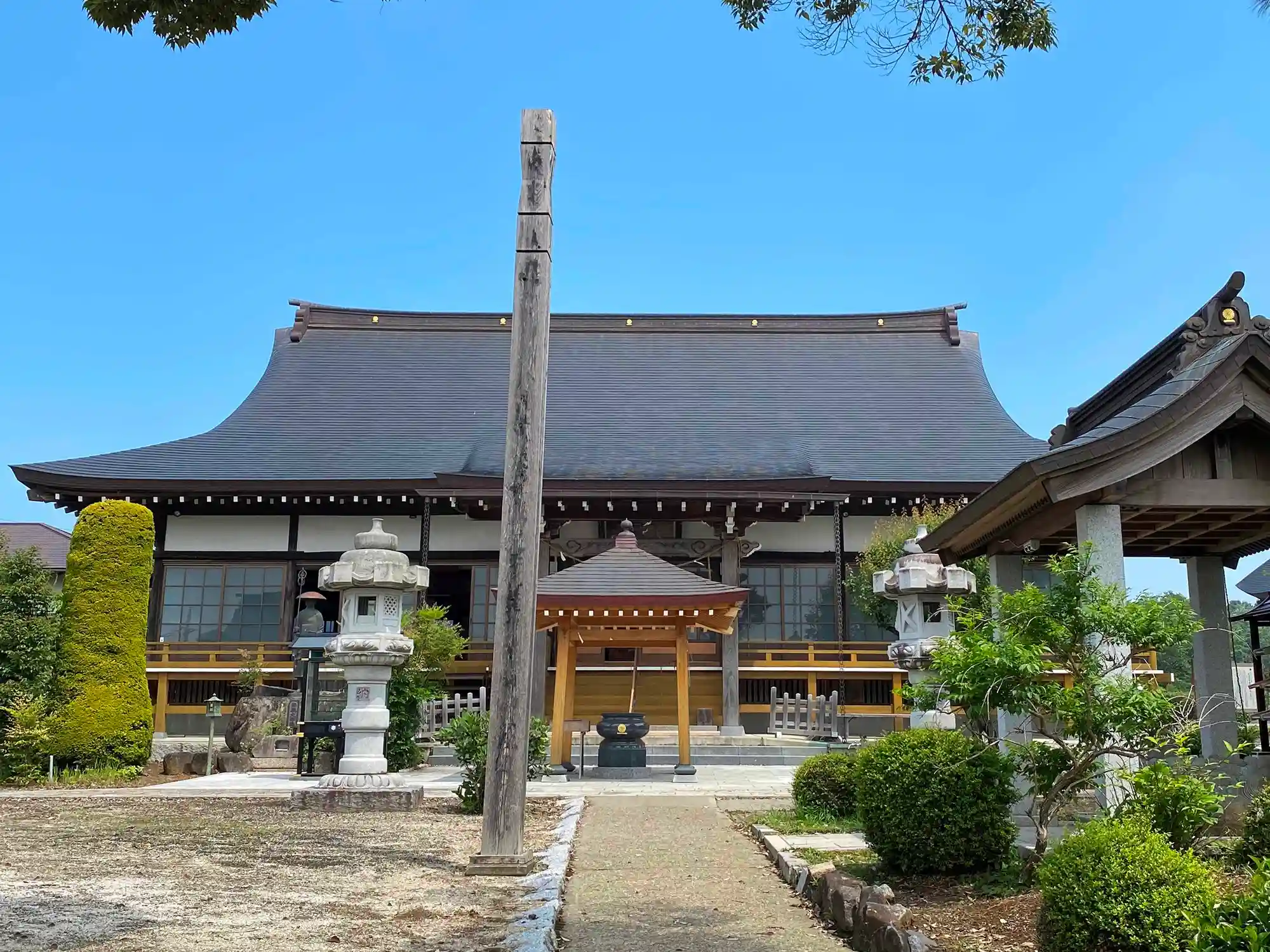 当寺は、JR常磐線・内原駅の北東4km弱のなだらかな丘陵地にある。クルマだと常磐道・水戸ICから北西に2kmちょっと。境内は広く、伽藍のある参拝エリアと墓地が完全に分かれている。樹齢数百年の椎の巨木はあるが、樹木は少なく、見通しが良い造り。境内伽藍は本堂と不動堂だが、見どころはユニークな形をした1595年建立の不動堂。一目見ると忘れないインパクトがある。
