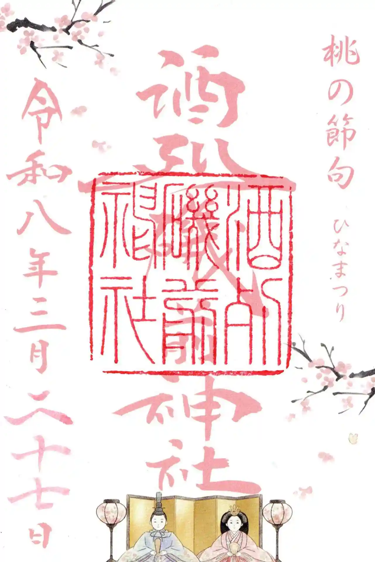 拝受した御朱印は、季節限定の「桃の節句(ひなまつり)」仕様。淡い桃色の文字で「酒列磯前神社」と記され、下部には微笑ましいお雛様のイラスト、隅々には可憐な桃の花が配されています。中央に捺された「酒列磯前神社」の重厚な印が、この華やかな意匠をしっかりと引き締め、春の喜びを凝縮したような一枚です。