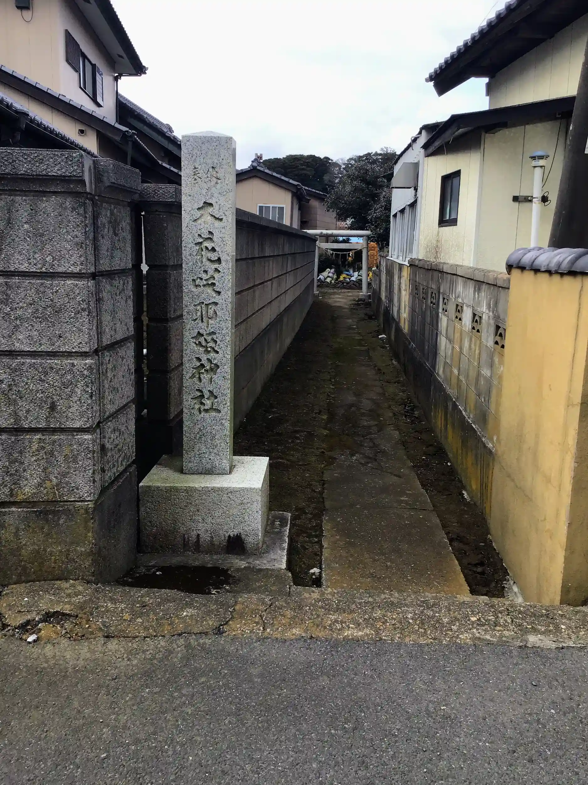 民家の間の細長い路地が参道でその奥にこじんまりとした神社が鎮座しています。