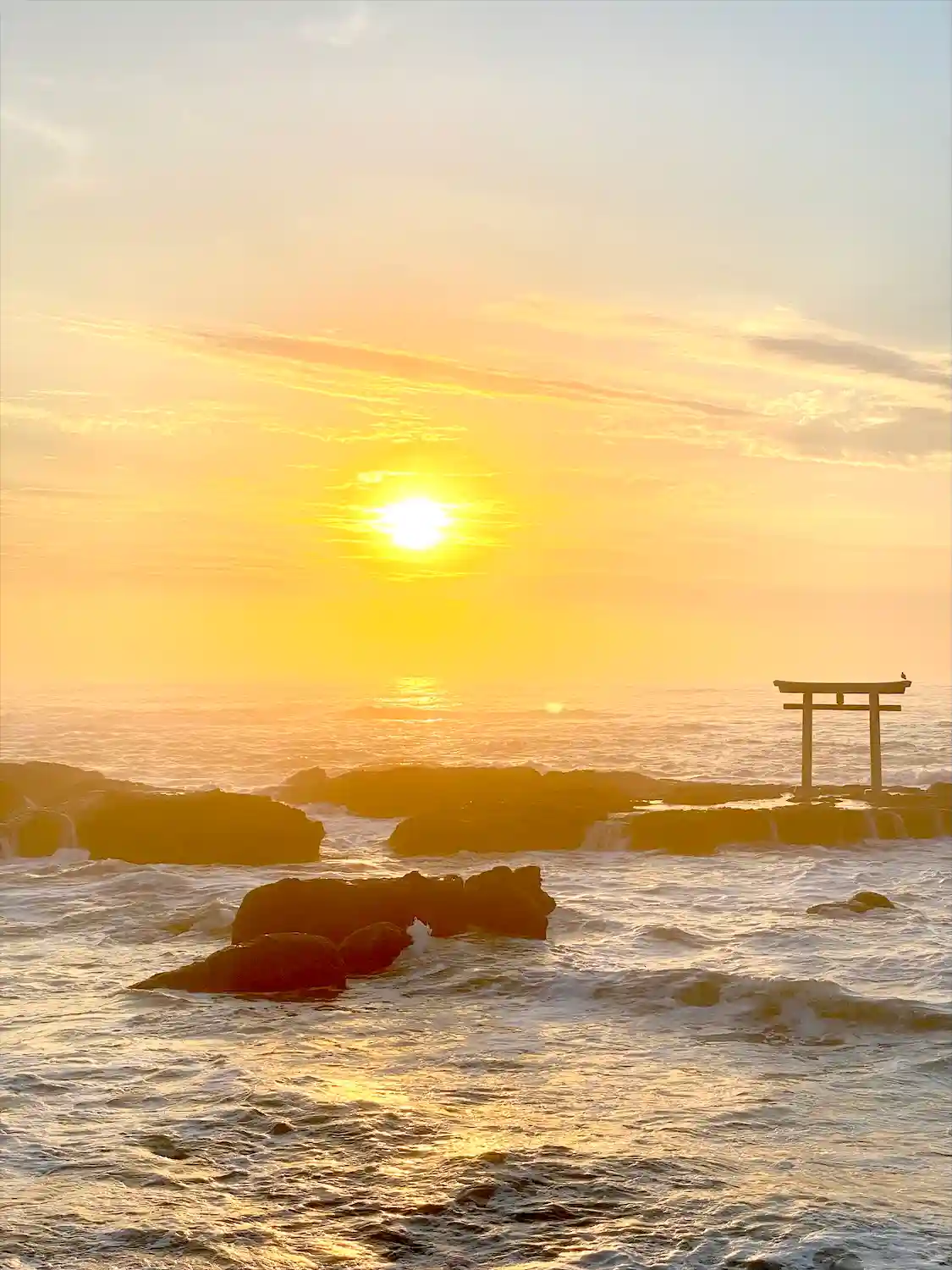 朝日が登って直ぐにみた祭神降臨したと言われる神磯の鳥居、とても綺麗でした🥺