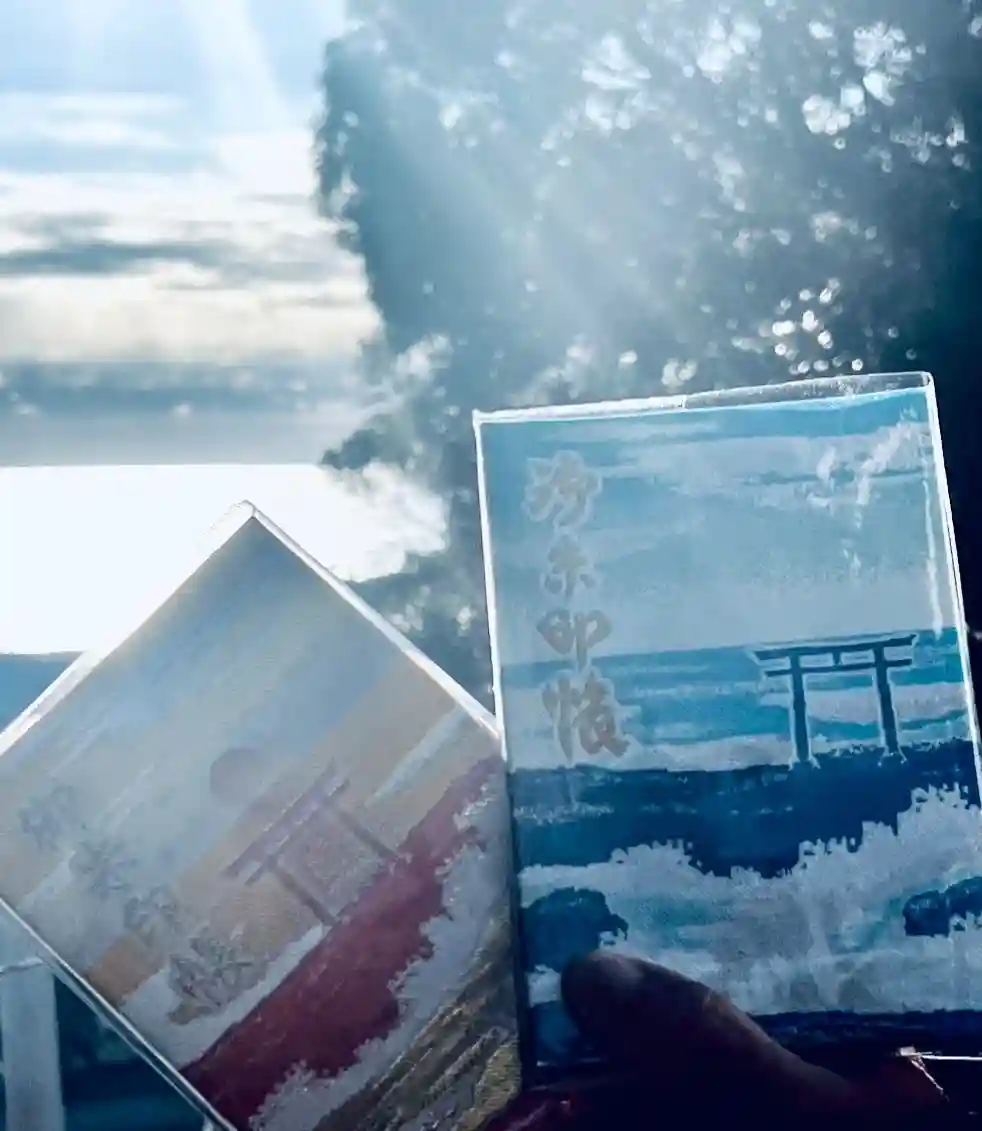 見開きで地に「神磯(かみいそ)の鳥居」の風景がデザインされています。