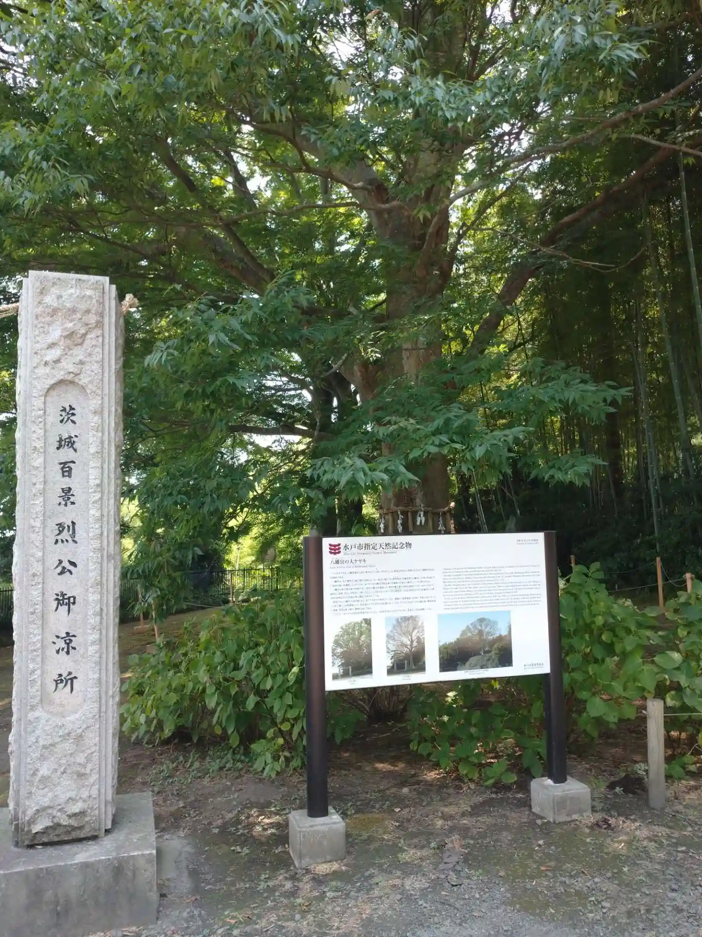 その後は境内の北端にある「烈公御涼所」に行き、ケヤキの根元で斉昭公になったつもりで、少しのあいだ涼みました。
