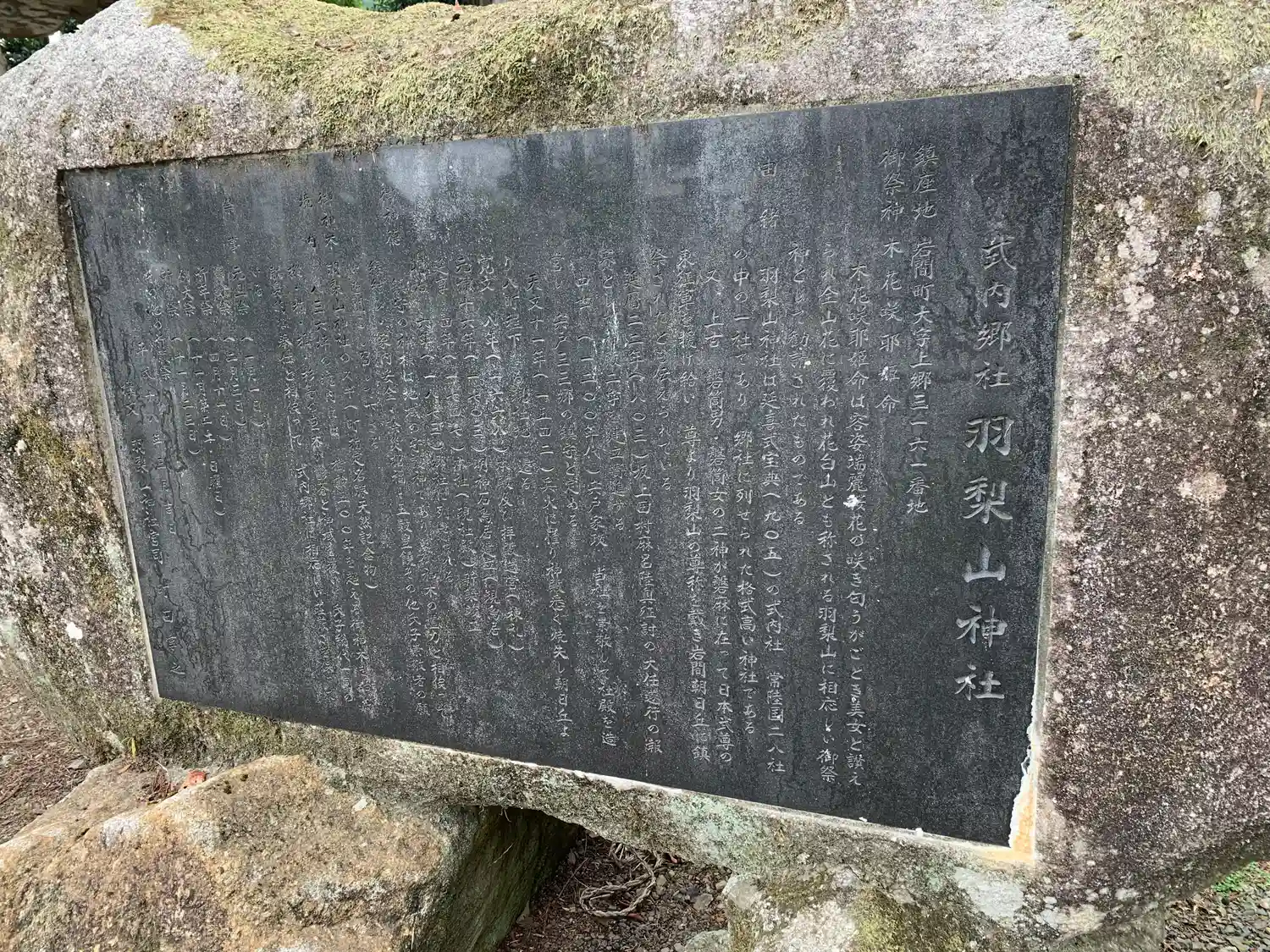 社号標はないのかと思っていたが、正面に戻ると低くて控え目な<社号標>を発見。<式内 羽梨山神社>と刻まれている。