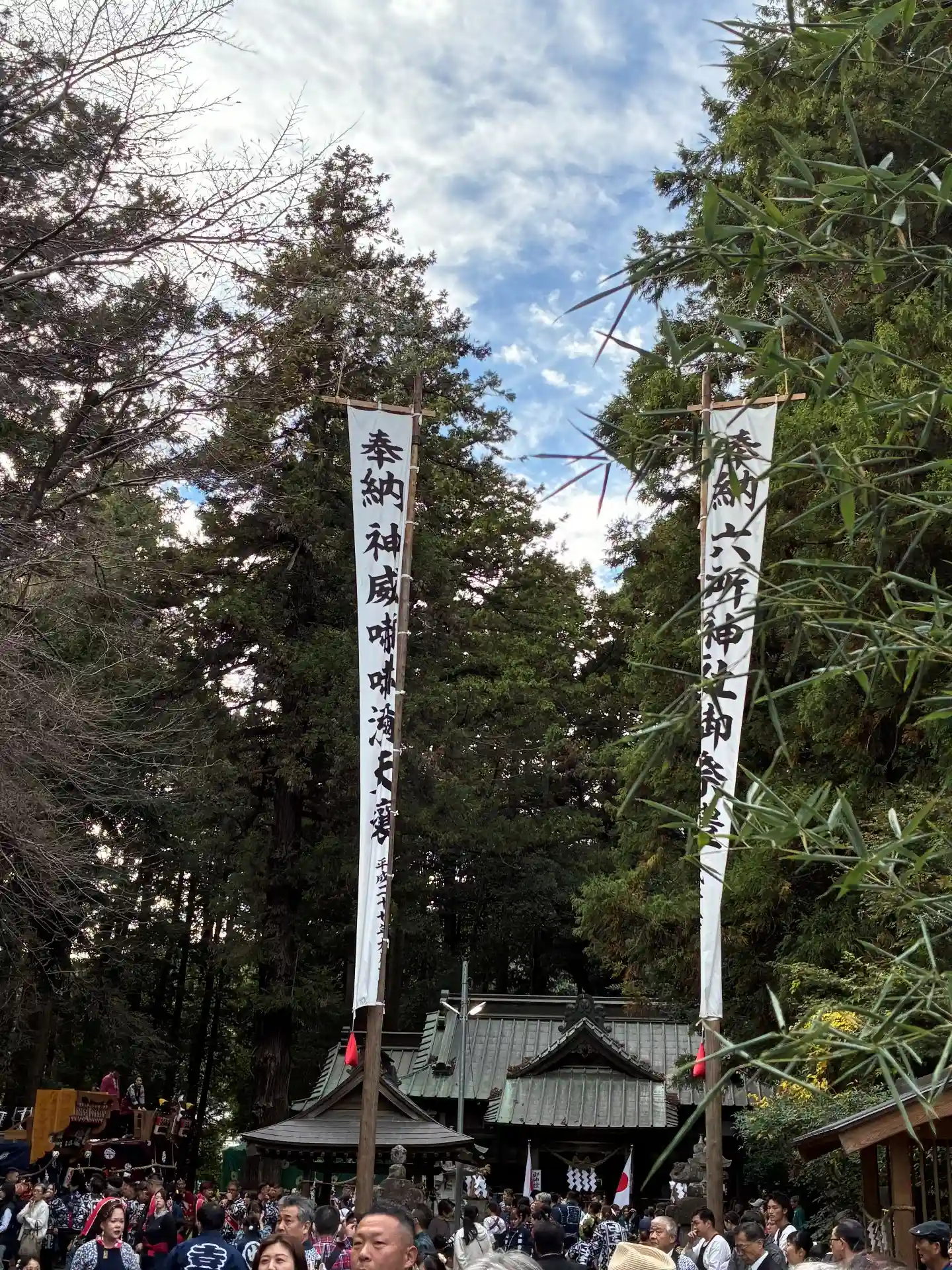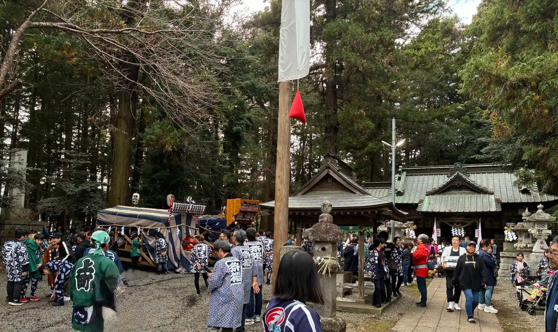 駅前の駐車場から歩き始めると、神社へ集合する山車の行列に合流してしまい、