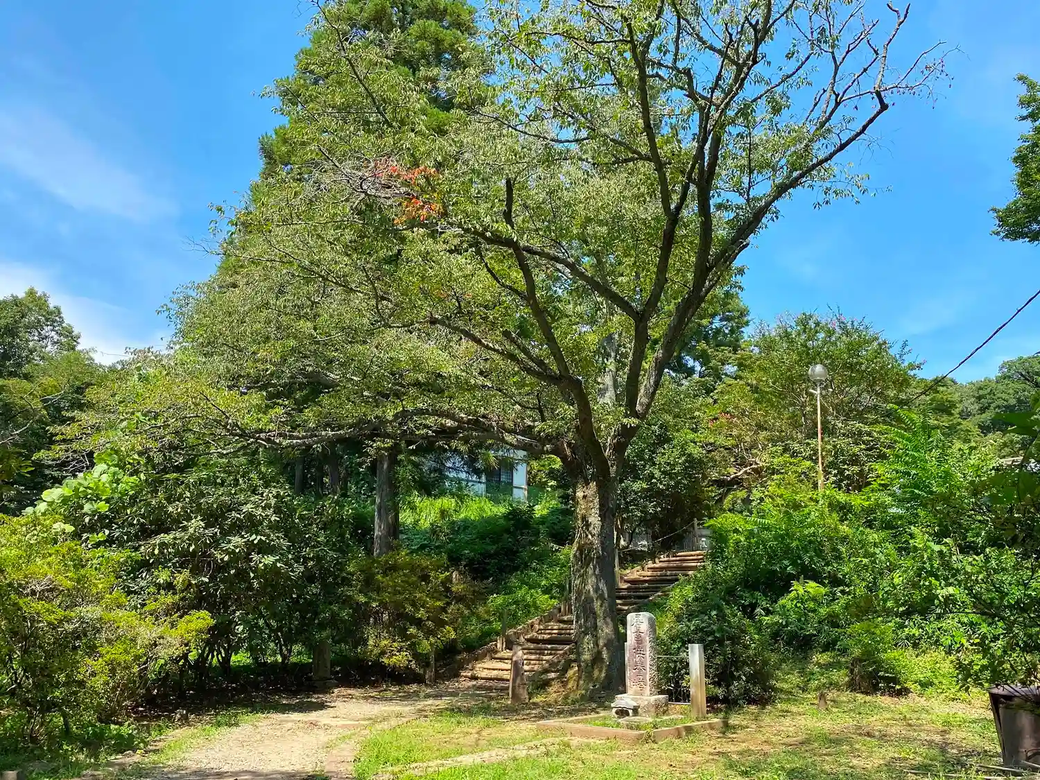 階段を上がると参道が右方向に曲がる。立派な高木が迎えてくれる。