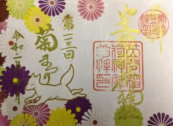 色鮮やかな菊花と稲荷大神様の神使であるおきつね様がデザインされた御朱印で、右面は笠間稲荷神社と金文字で書かれ、右上に常陸笠間鎮座の印、真ん中に笠間稲荷神社参拝の印、左面は第一一三回 菊まつりの文字が入っています。