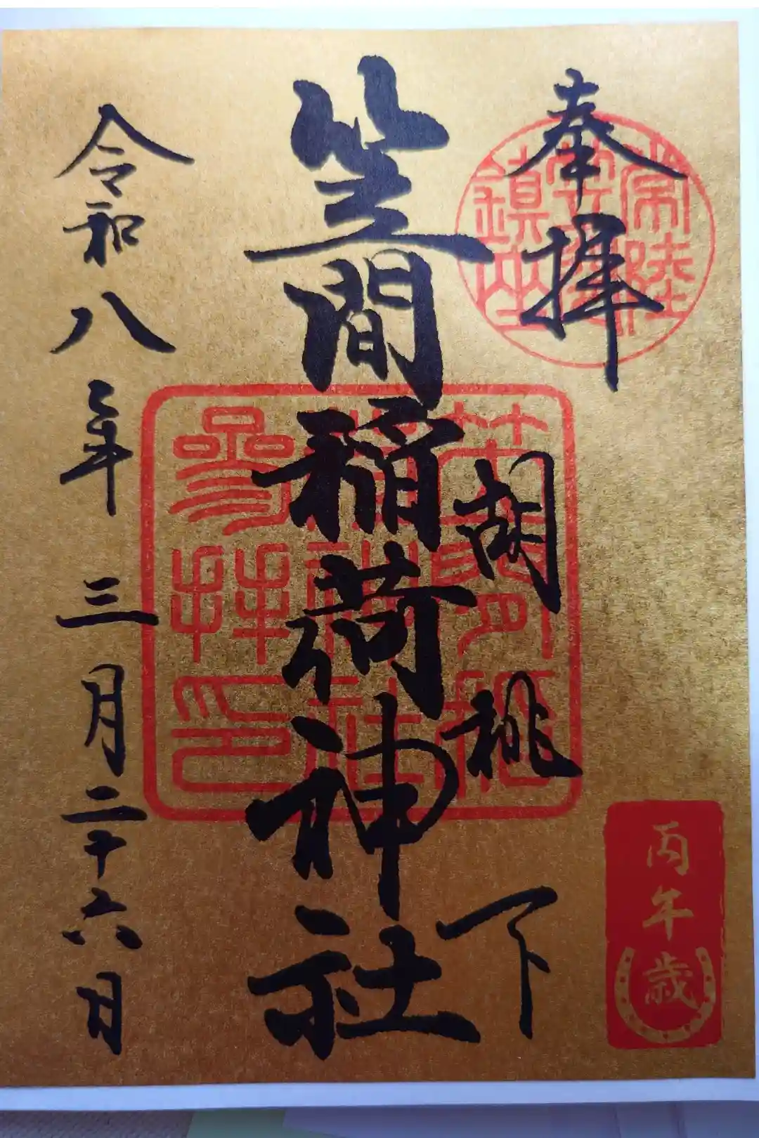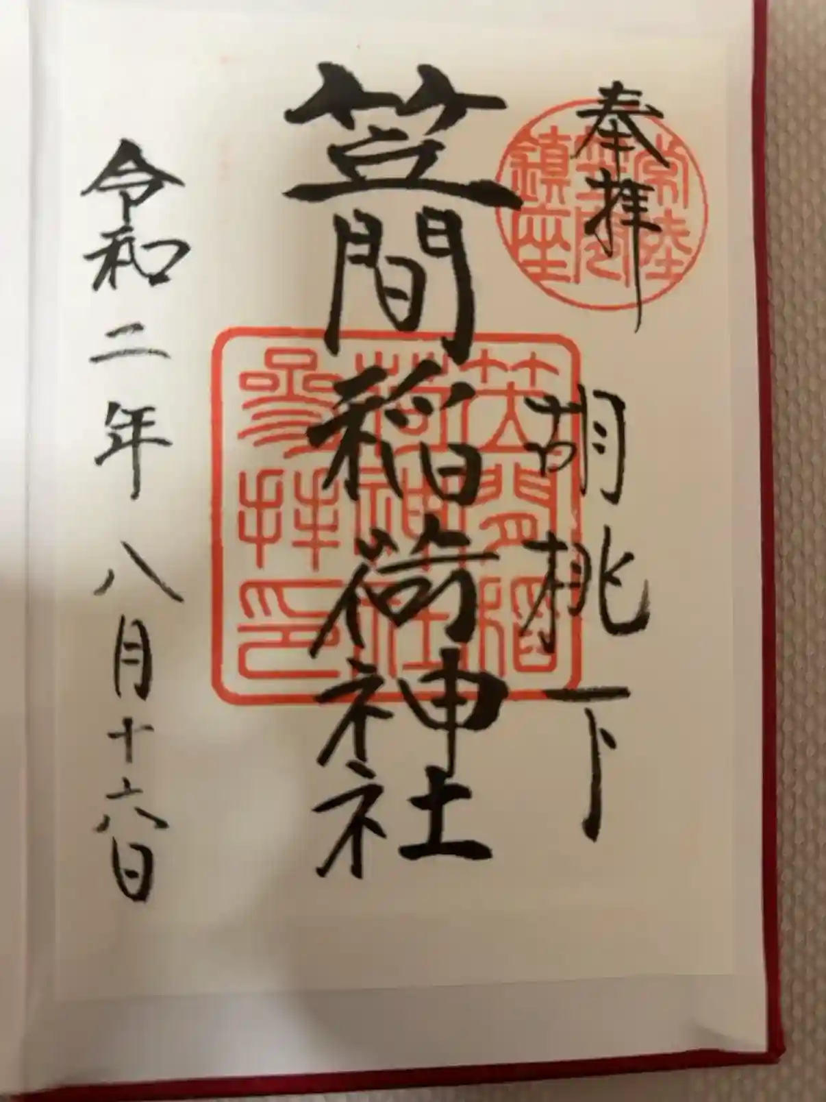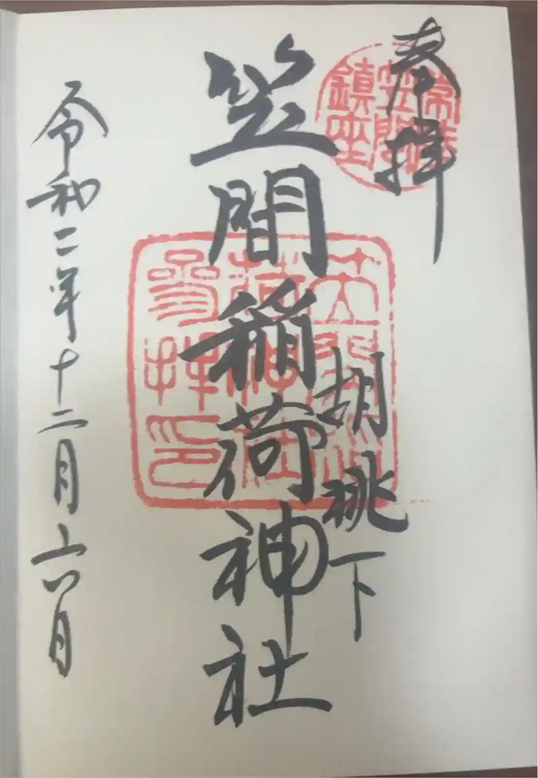 真ん中に笠間稲荷神社と書かれ、右上に常陸笠間鎮座の印、真ん中に笠間稲荷神社参拝の印、右下に胡桃下の文字が入っています。