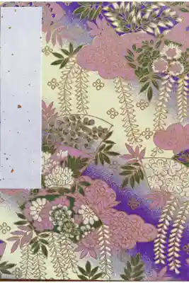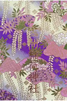 紫と黄色のグラデーションの地に、藤などの植物が描かれた御朱印帳です。裏面に笠間稲荷神社の文字が入っています。