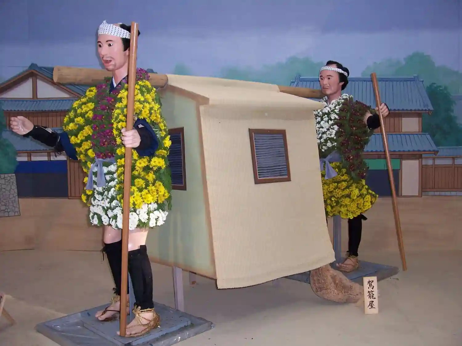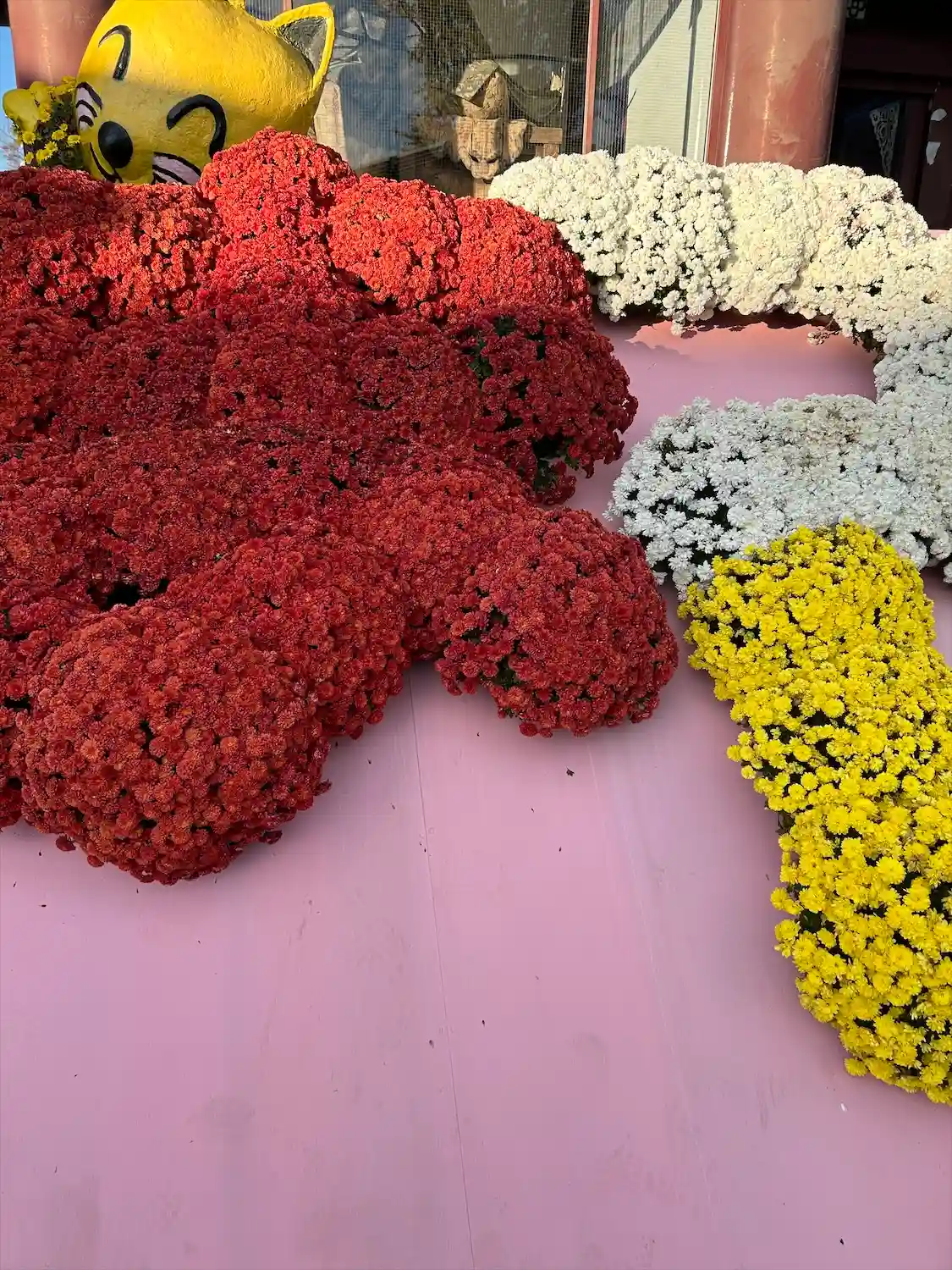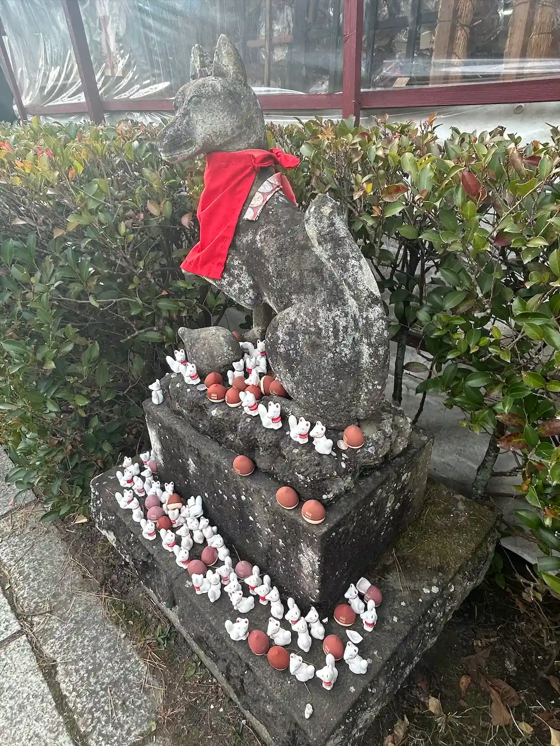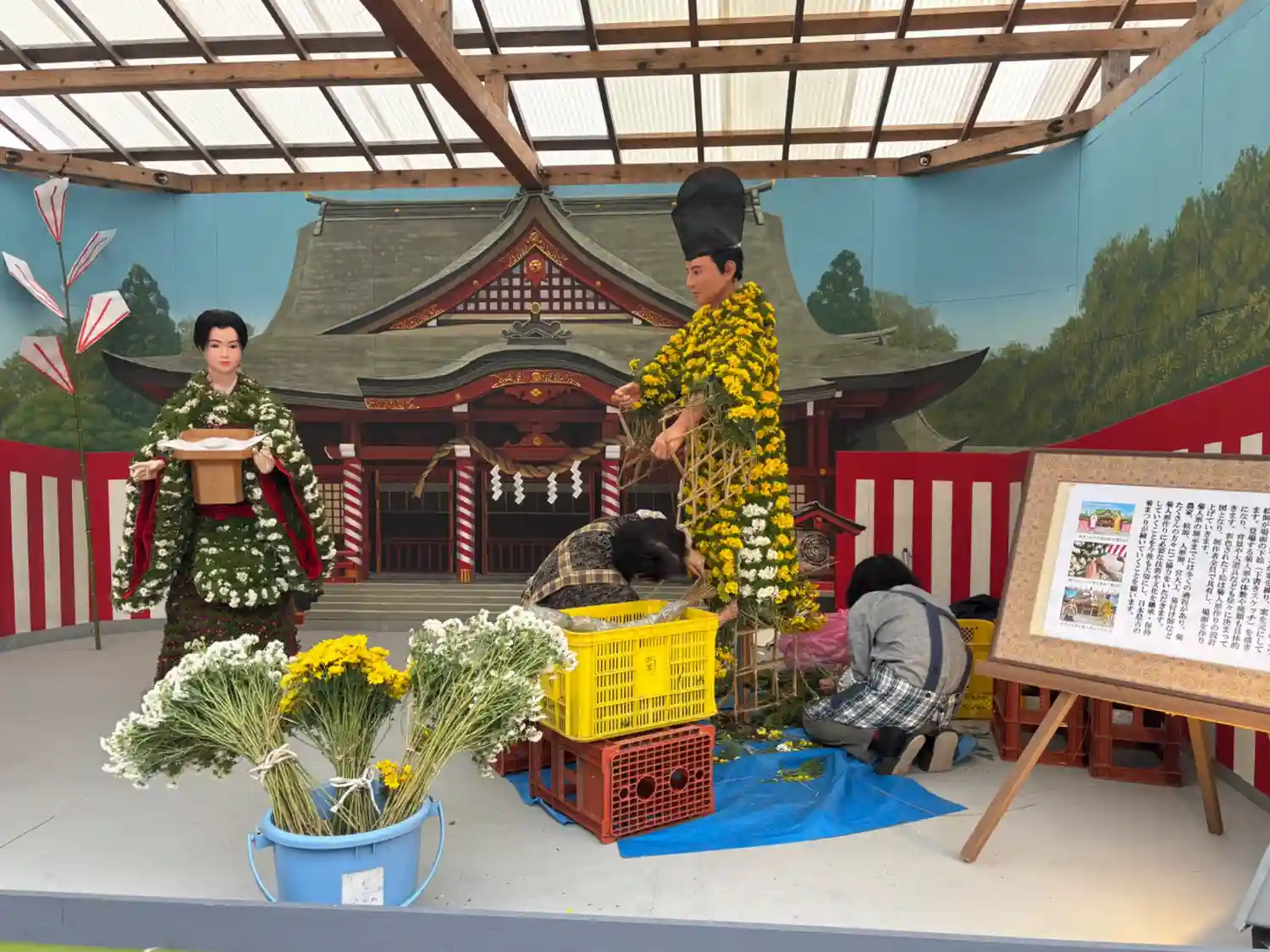 拝殿横に菊でできたきつねさんがにひきいました。