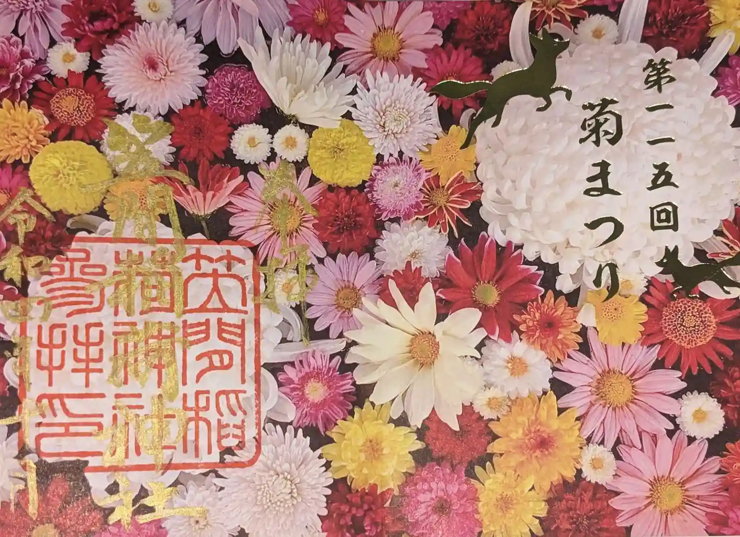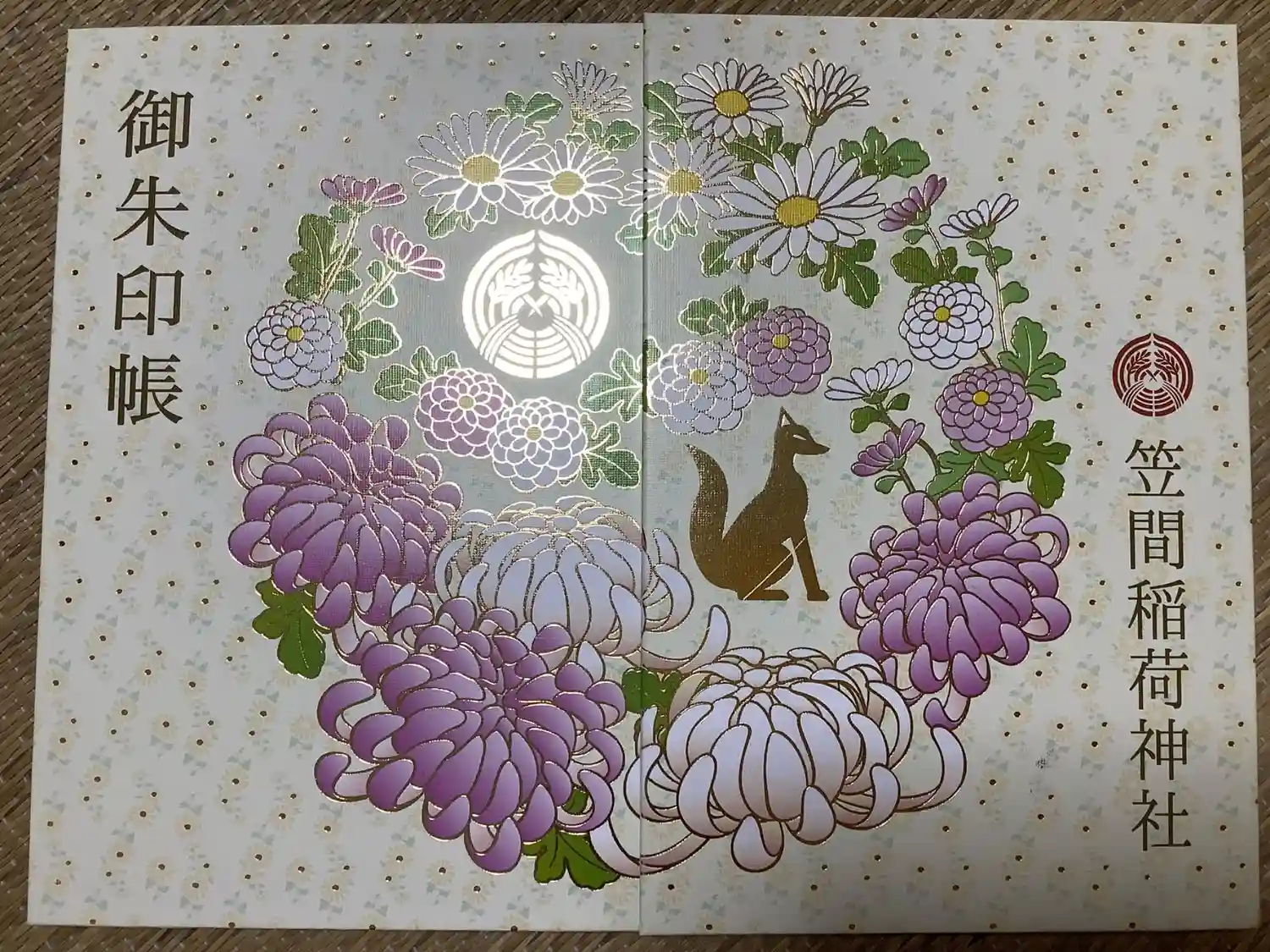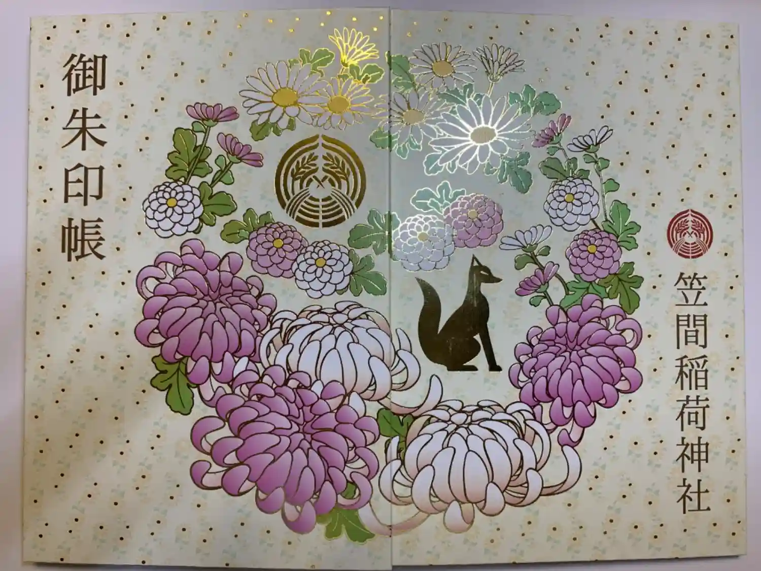 菊まつり限定御朱印帳。お狐さまと菊の花の線は金の箔押しで、水玉模様にみえるのは全て小菊です。