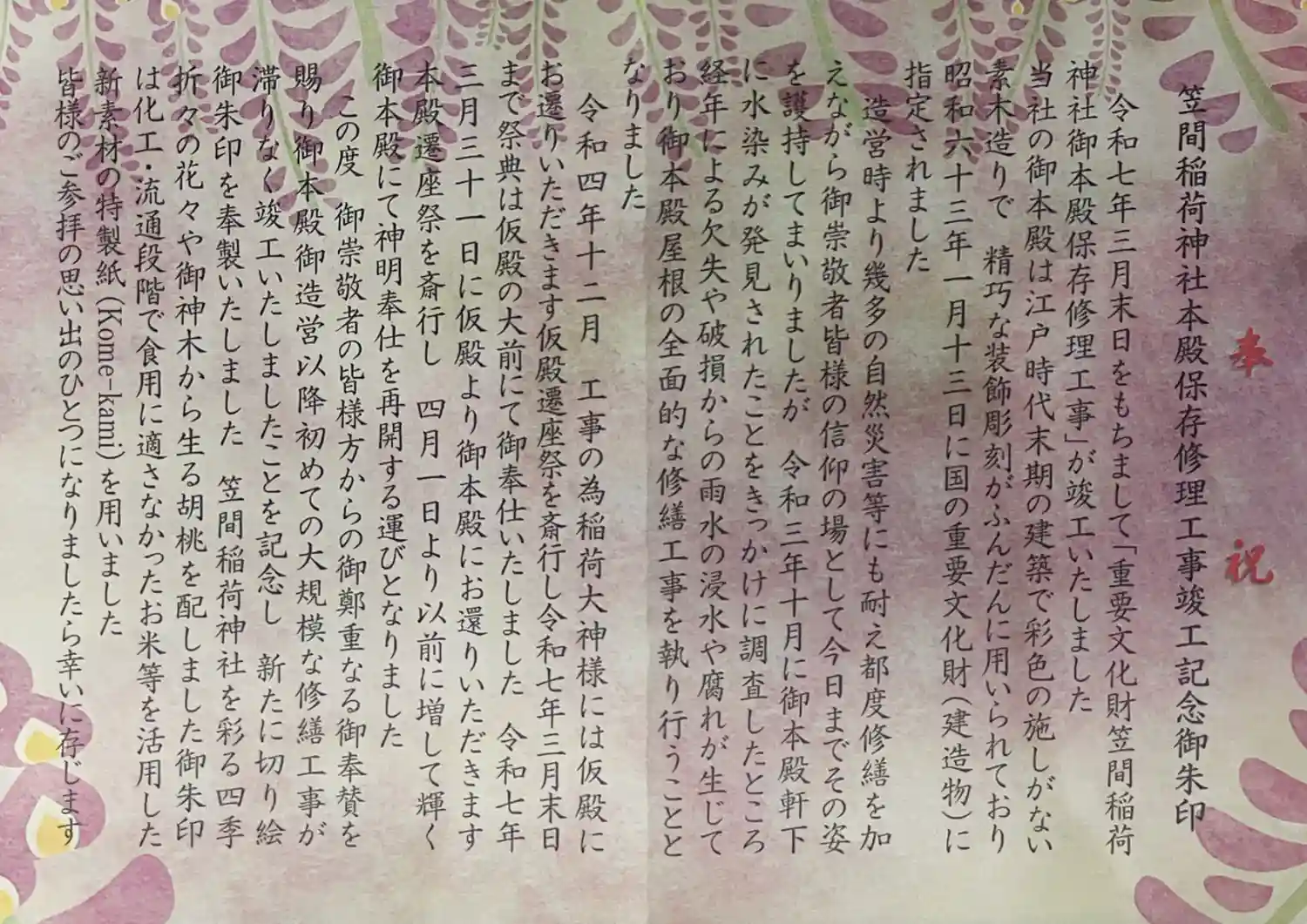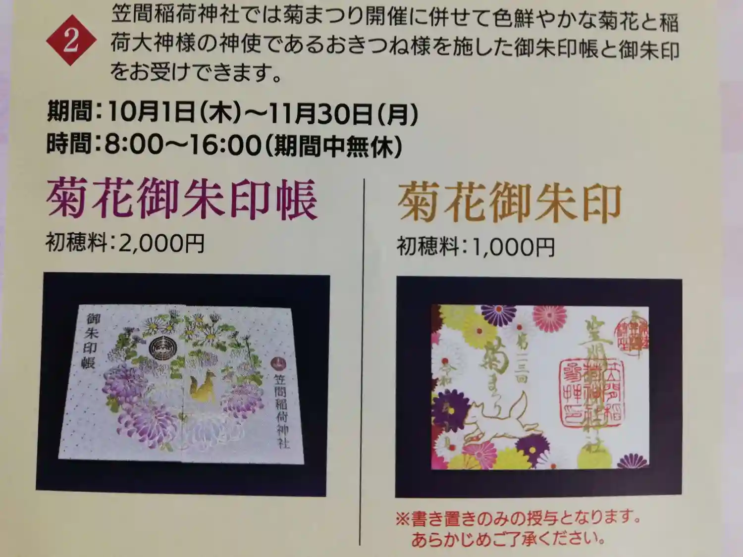 笠間稲荷神社で菊まつり期間より長い2ヶ月間授与される御朱印帳と限定御朱印。JR東日本の菊祭りパンフレットより。