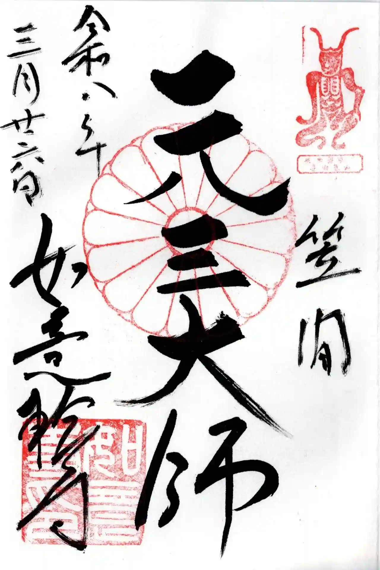 拝受した御朱印は、圧巻の「元三大師」の墨書き。中央には菊の御紋が鮮やかに捺され、右上には魔除けの象徴である「角大師」の朱印が力強く構えています。7種類もの書き入れ御朱印が用意されているなか、この一際厳かな一枚を選んだことで、身の引き締まるような活力を授かりました。満開の桜に彩られた静かな観音の里で、春の息吹と仏様の慈悲に深く包まれた、心豊かな参拝となりました。