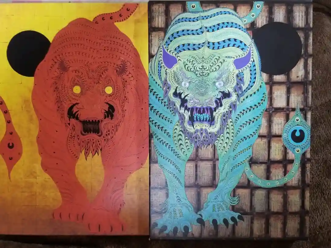 右下に大黒さま、真ん中に常陸國出雲大社と書かれています。御朱印帳はしめ縄モチーフにしたものと、3人のアーティストとコラボしたものがあります。 | |||