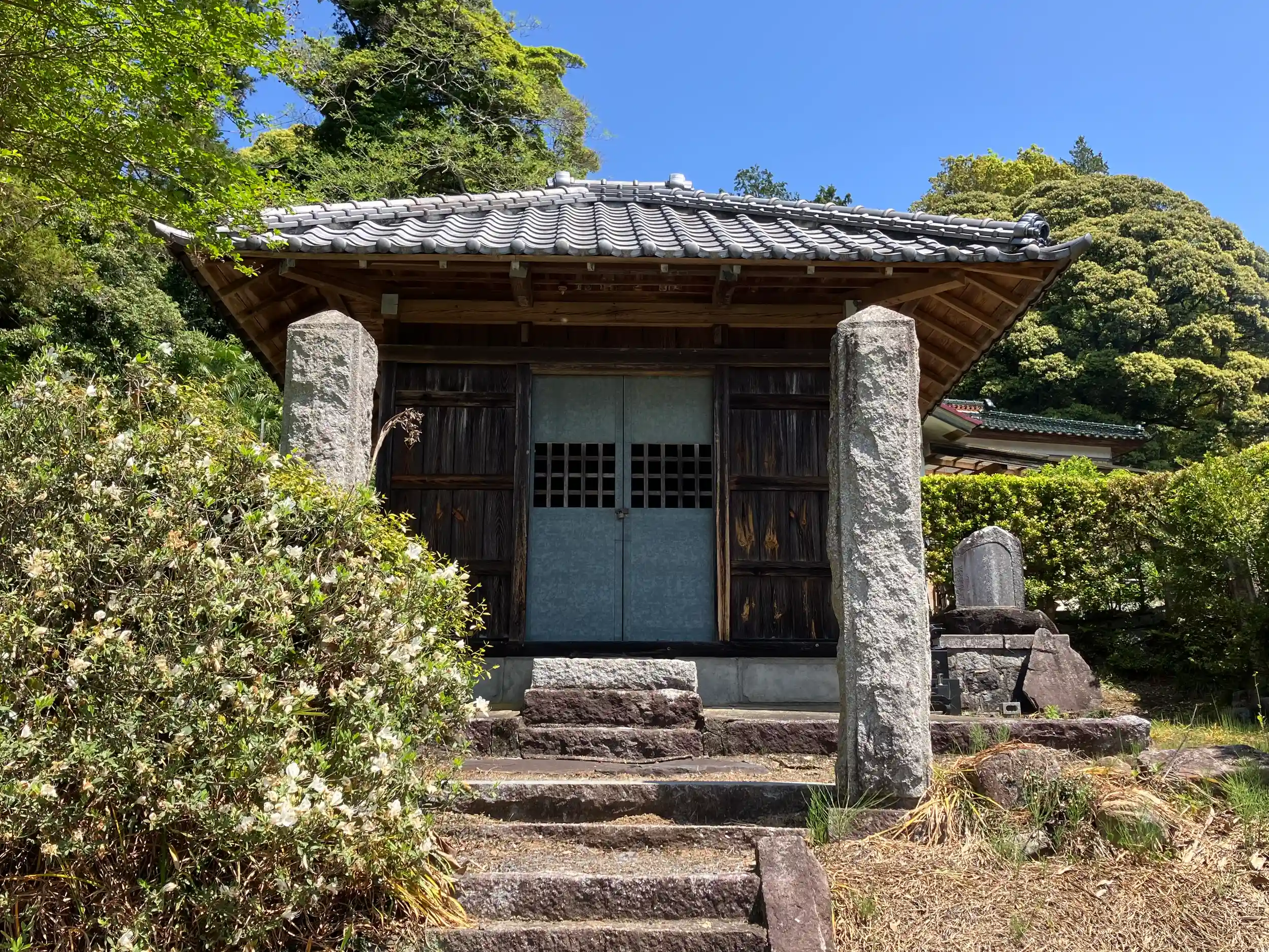 本堂は朽ちて崩壊しかかっている。本堂奥には小田家の一族の墓とされる五輪塔が並ぶ。