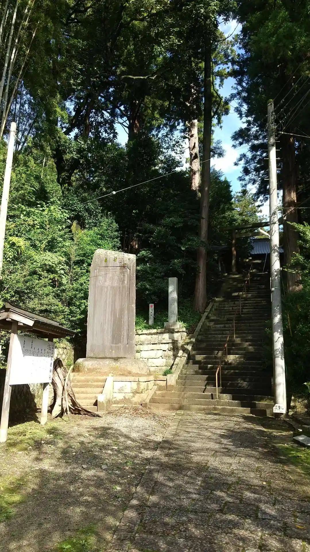 いよいよ高台の境内への階段。巨大な石碑は<神域改修記念之碑>。その後ろには2つ目の<社号標>。