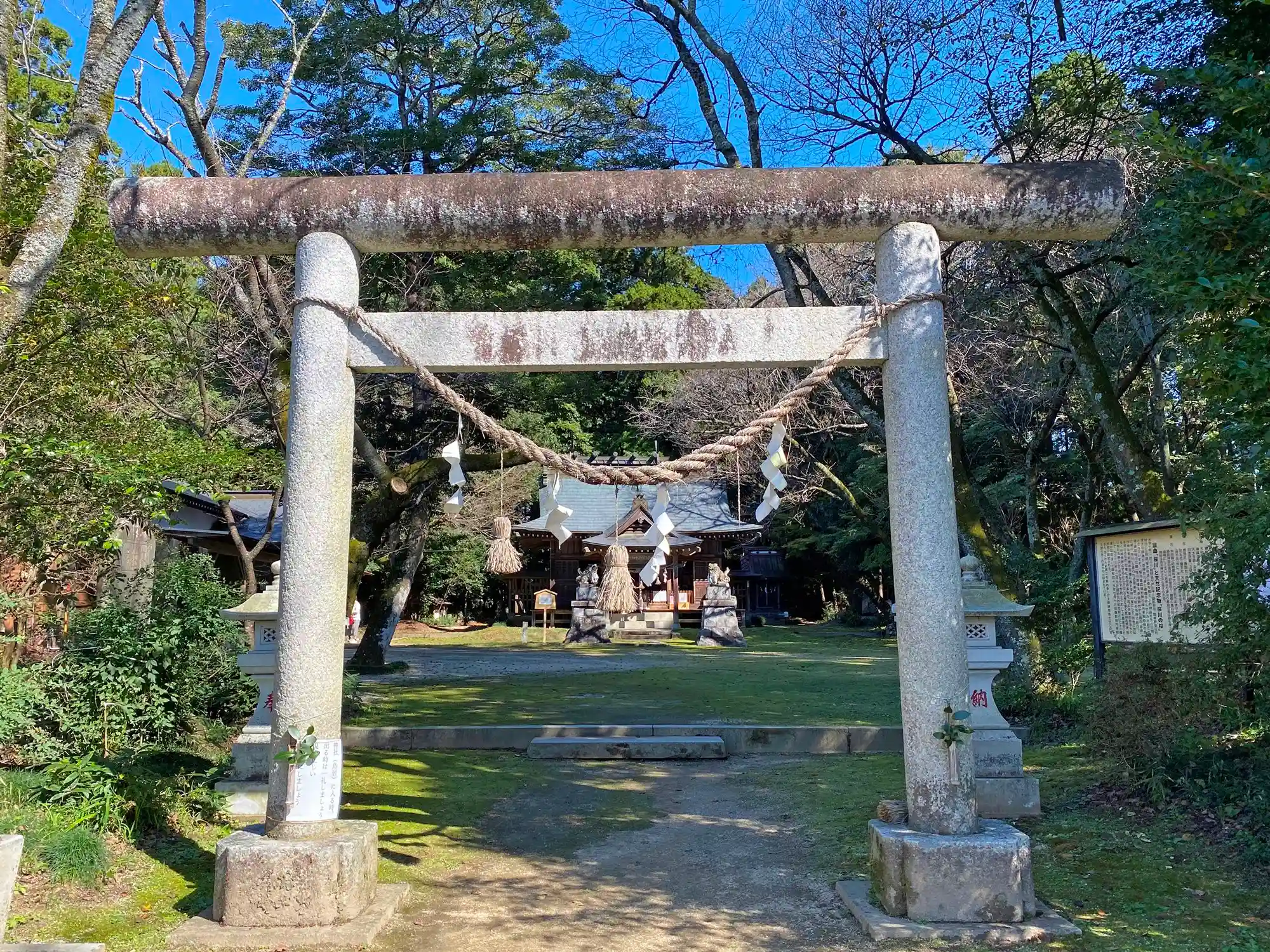 入口の<鳥居>。注連縄にぼんぼり付き。鳥居から社殿までは広いスペースが広がる。