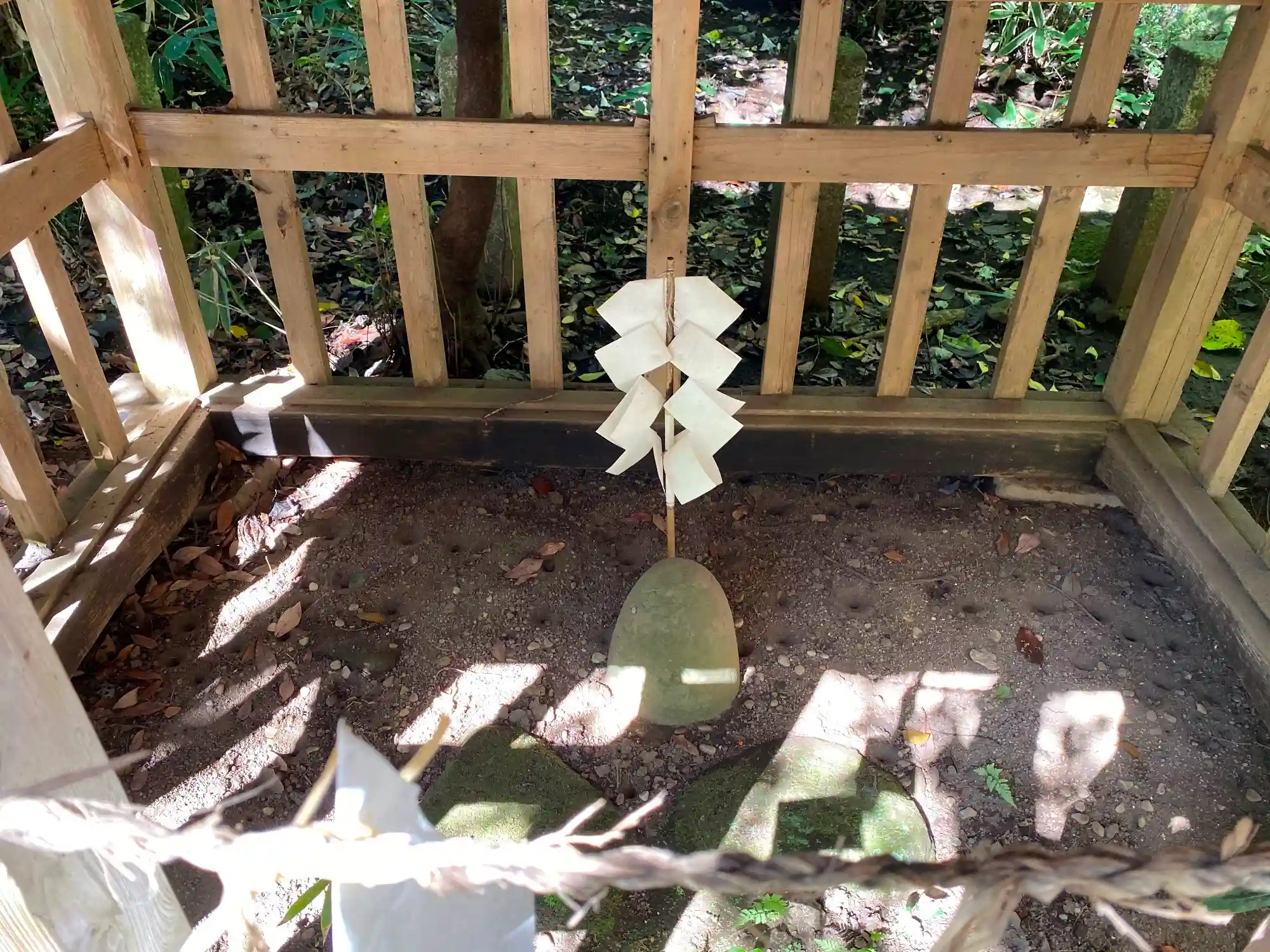 社殿の左側にある<要石(かなめいし)>。当社は鹿島神宮の戌亥(北西)の方角にある鎮守の社とされ、鹿島神宮の凹型の要石が鯰の頭を押さえ、当社の凸型の要石が鯰の尾を押さえていると伝わる。