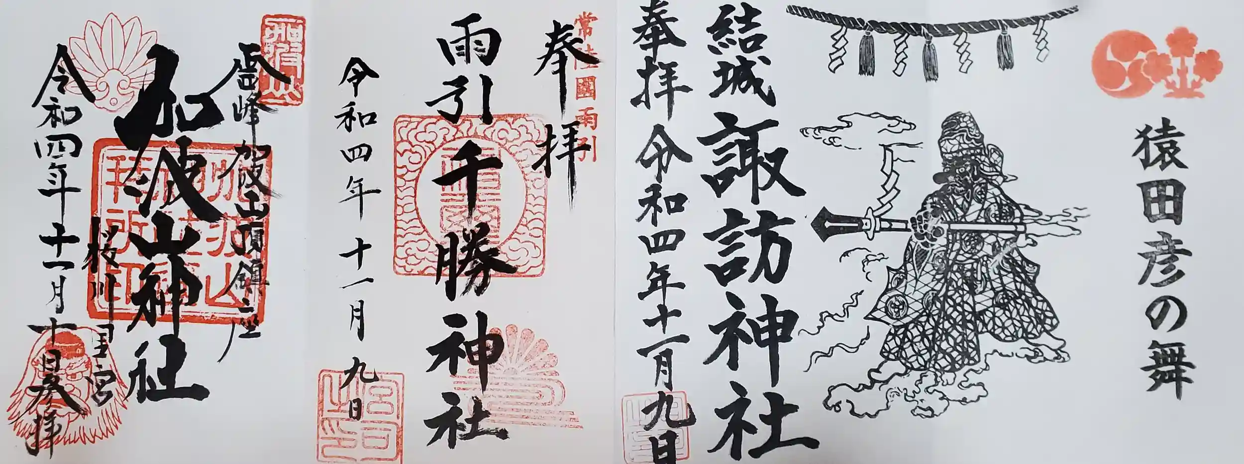 結城諏訪神社は月替り朱印の題材となってる大々神楽の他はは猿田彦命との関係が薄いので、受印時はやや釈然としないものを感じたのですが、この並びにするための布石だったのね(゚∀゚)