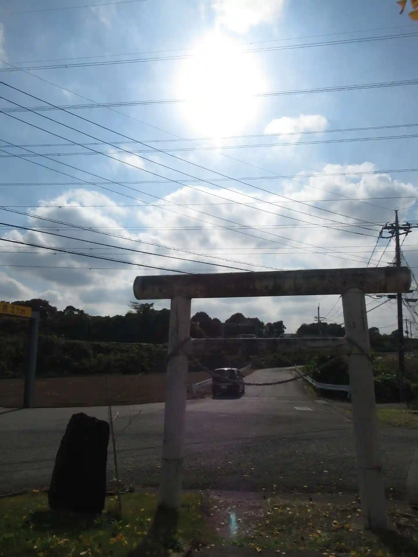 お社の正面、100メートルほど離れた場所に、常磐高速道が走っております。高速道の向こう側も農村が広がっている、つまり農村を引き裂くかたちで、高速道があるわけです。