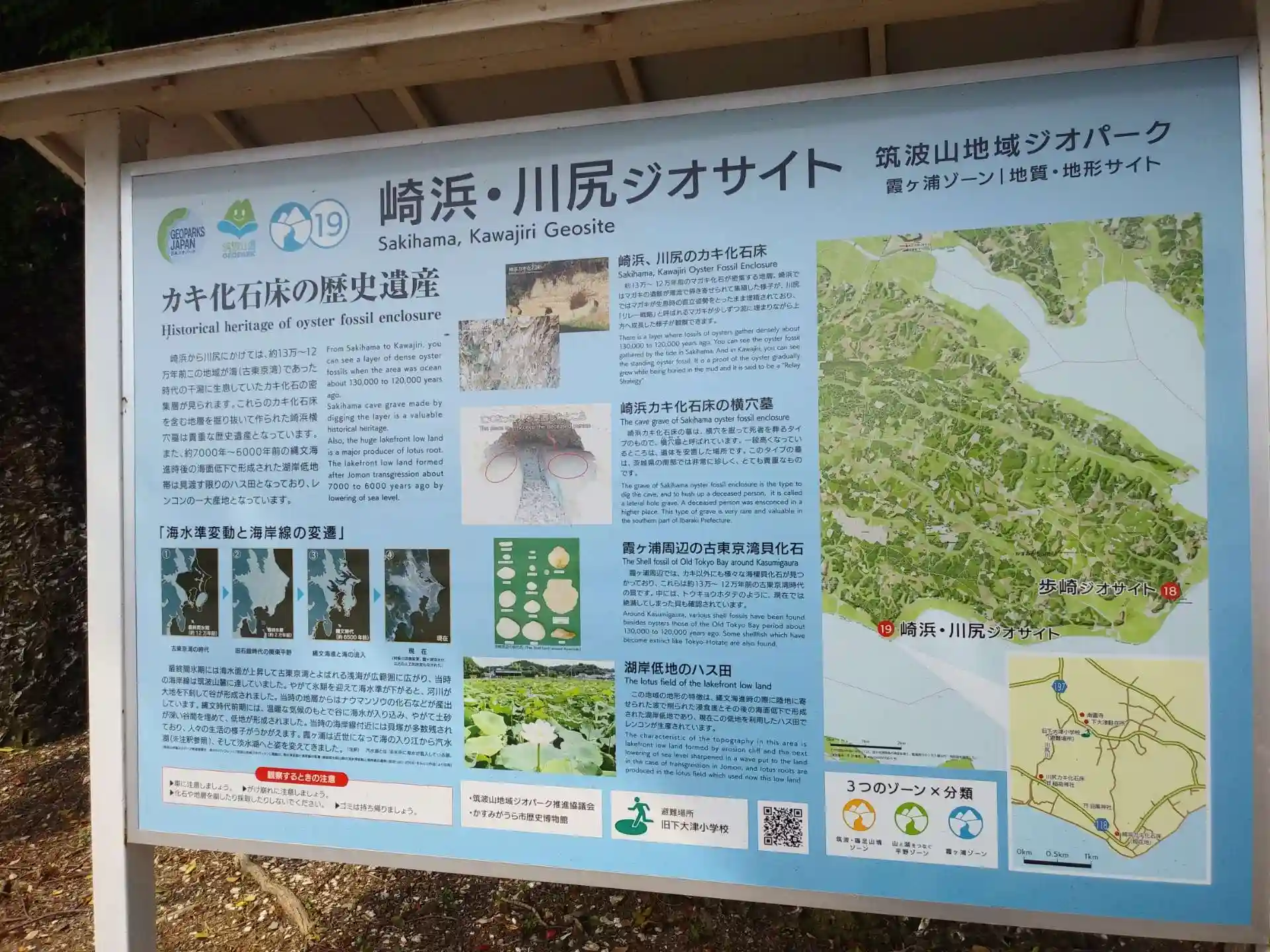 立て看板に詳しく説明があります。約13億年から12億年前、関東平野が古東京湾といわれる海に覆われていた時代、この辺りは、牡蠣などが生息する干潟であったようです。