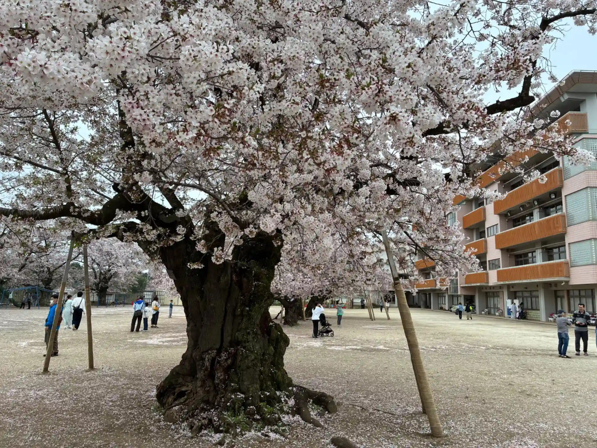 隣の小学校の校庭の中央に桜の大木が何本もあって、有名なんです。