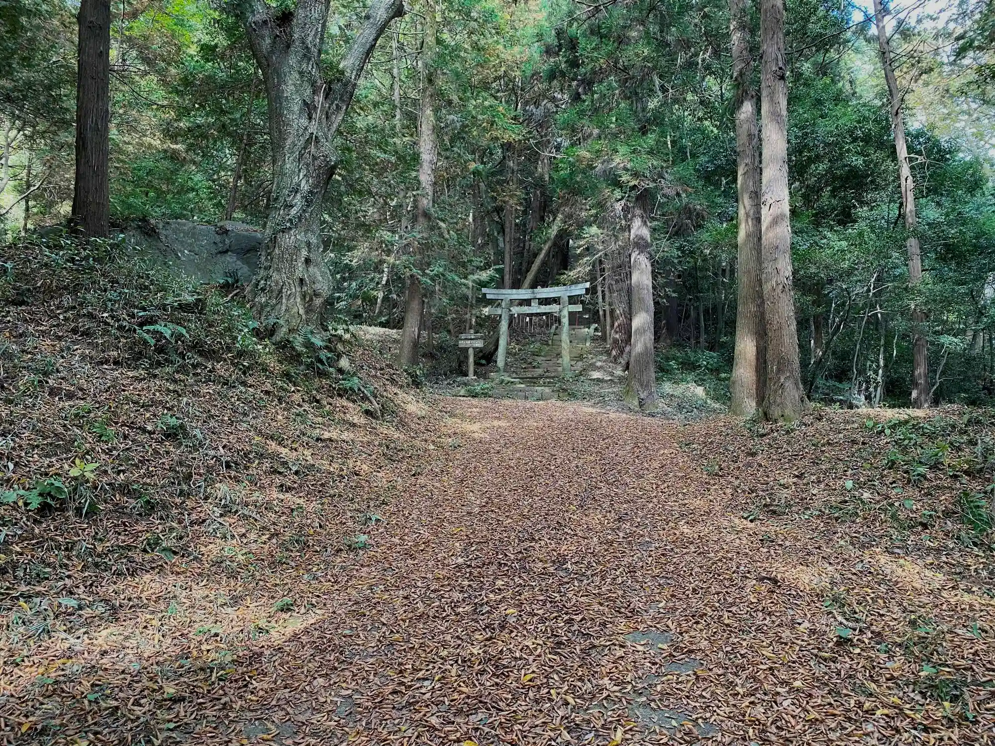 50mか、100mか、急坂を駆け上ったところでこの景色。<二の鳥居>は見えるが、手前は全面枯葉で、平坦で駐車できる場所はない。それどころか、Uターン(転回)できる場所もない...(;゚Д゚)ヤバイ