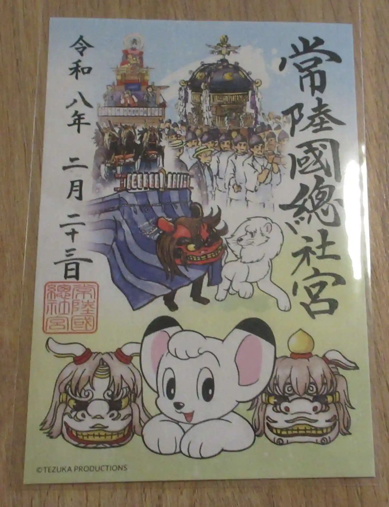 現在の石岡市が府中松平藩と呼ばれていた江戸時代末期、藩主・松平播磨守に仕えた手塚良庵という藩医がいました。世界的な漫画家・手塚治虫先生のご先祖です。常陸国総社宮では当地と手塚先生の御縁にちなみ、風土記勅撰千三百年の平成25年、手塚プロダクションの協力を得て先生の作品を象った授与品の頒布を開始しました。(神社ページより)