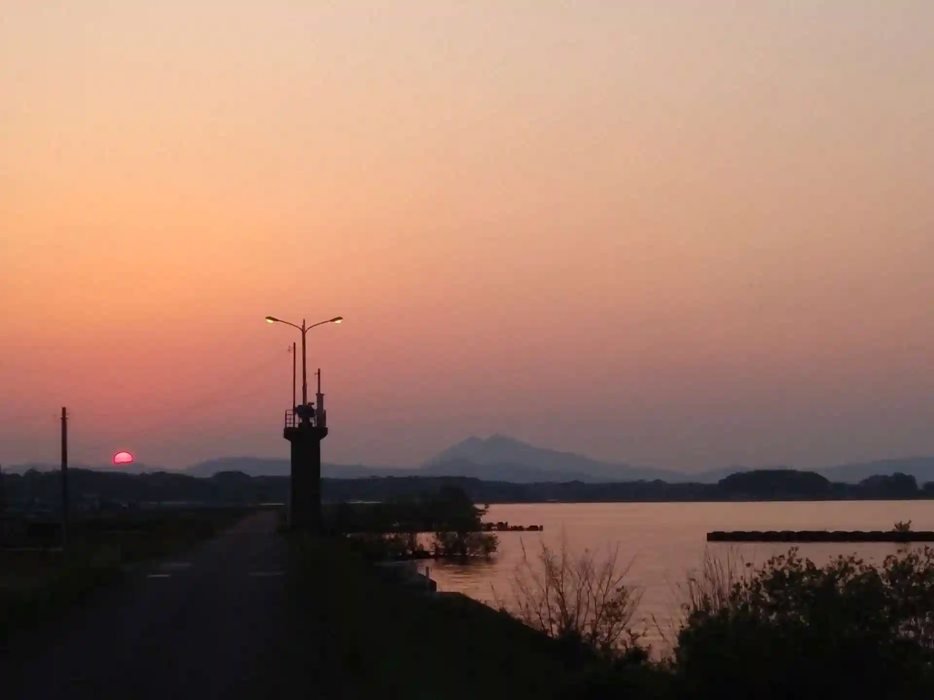 せっかくだから、写真だけでも撮っておこうと堤防の上で車を停め撮影します。キレイな夕日だから投稿しておきたいな…と思っていたら、なんと、真下に水神社がありました。