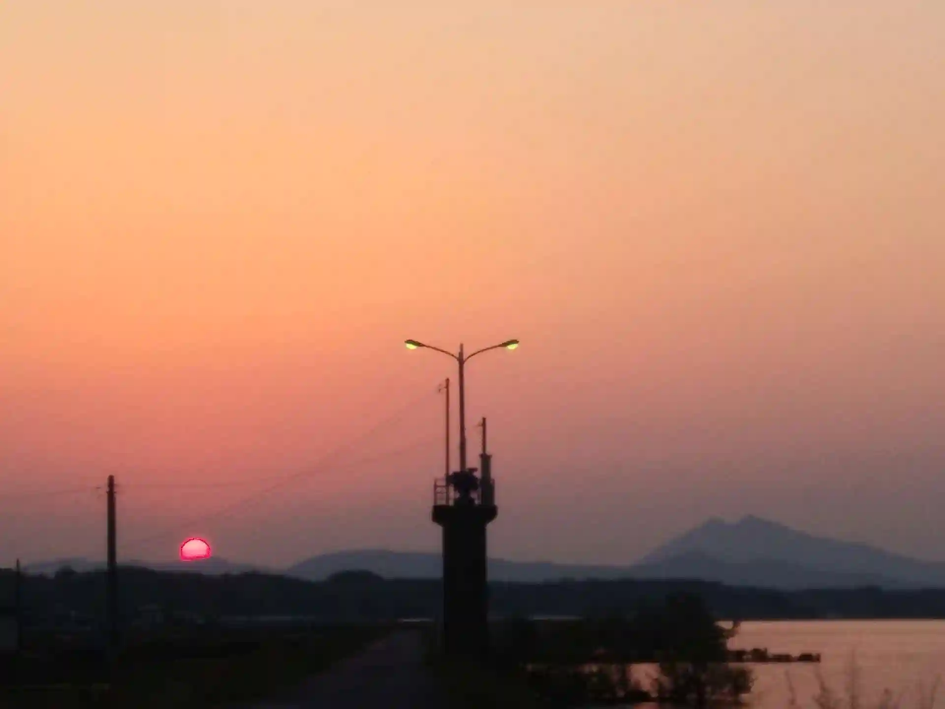 ふと、サイドミラーを見ると、筑波山の左側に夕日が沈んでいます。