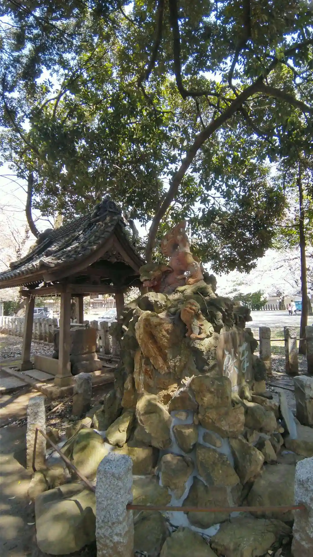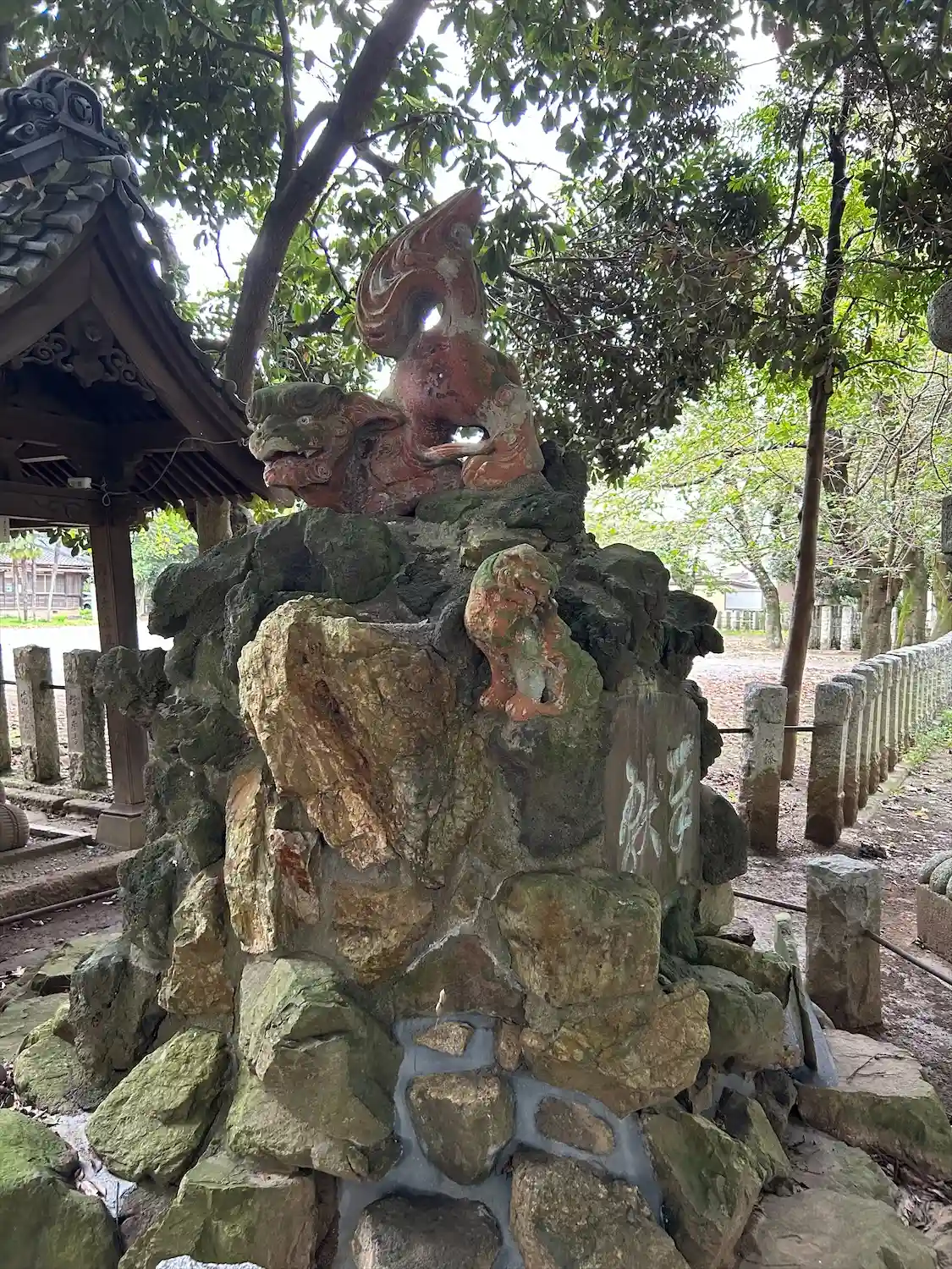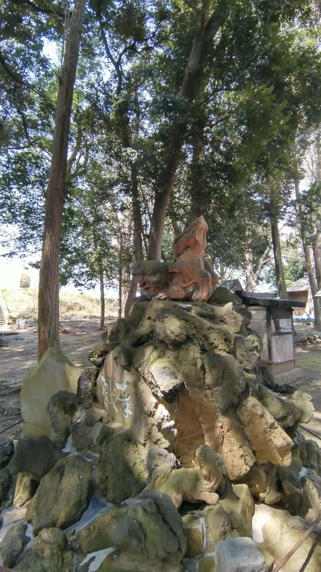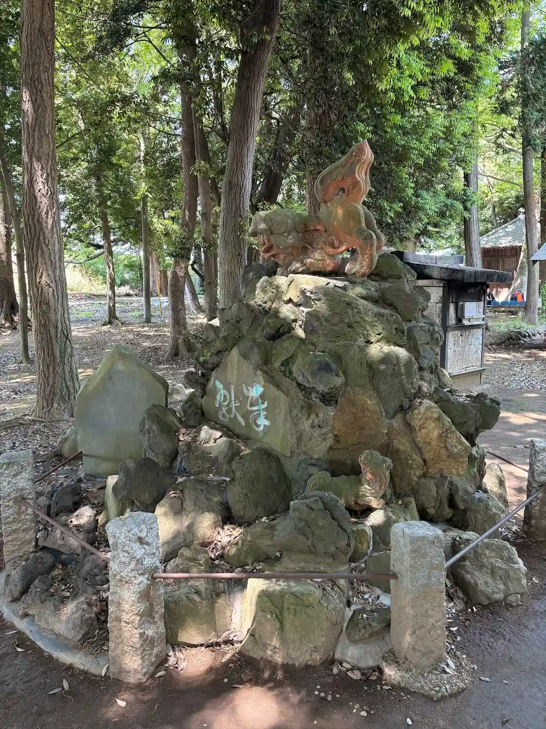 曲がった先。左右に狛犬。岩のうえに何体か狛犬がいるのです