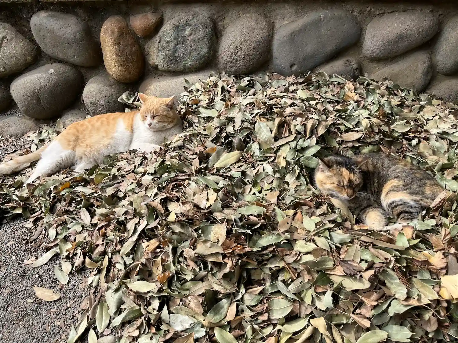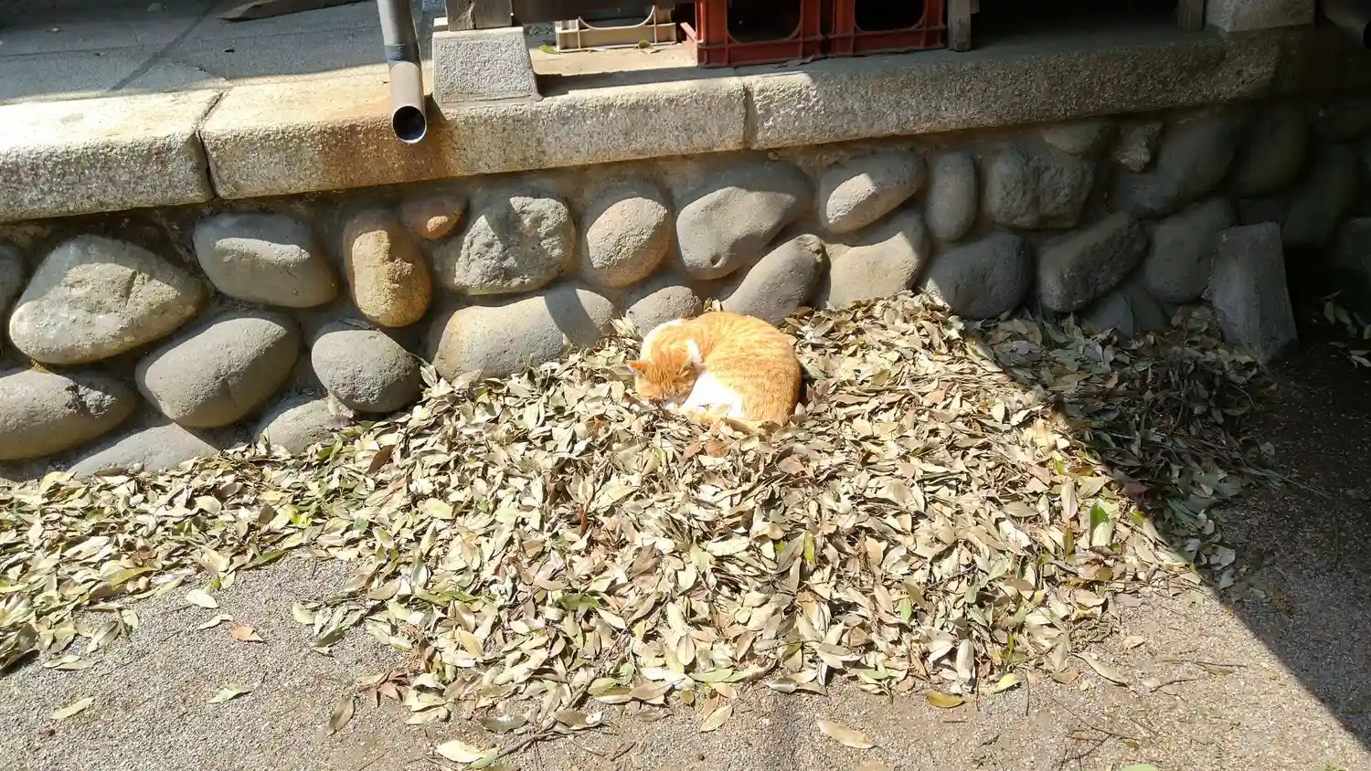 拝殿の横に掃き集められた枯れ葉の上にいた猫ちゃん
