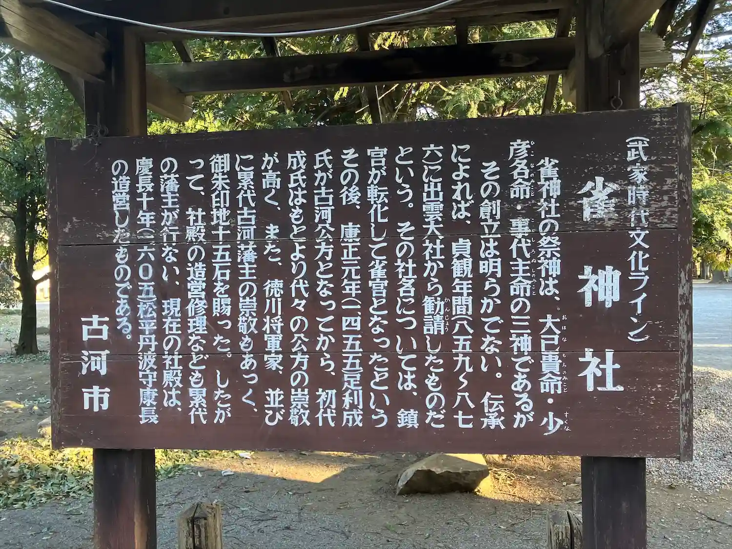 社名の 『雀』は『鎮め』が変化したものとされる。旧古河町の総鎮守。主祭神は大己貴命、少彦名命 事代…