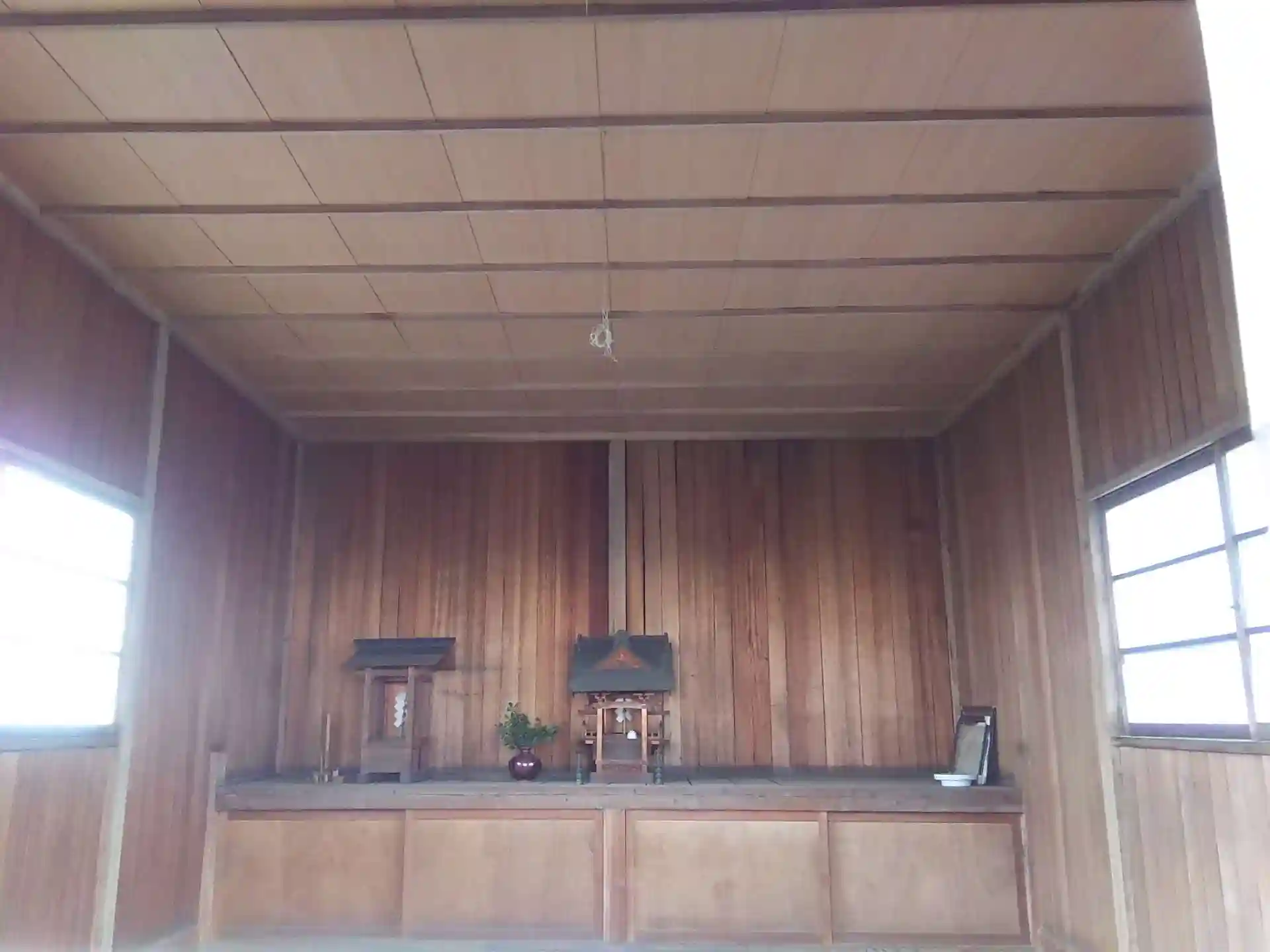 奥を見ると灯篭や狛犬がみえて、ポツンと小屋のように社殿が見えました。