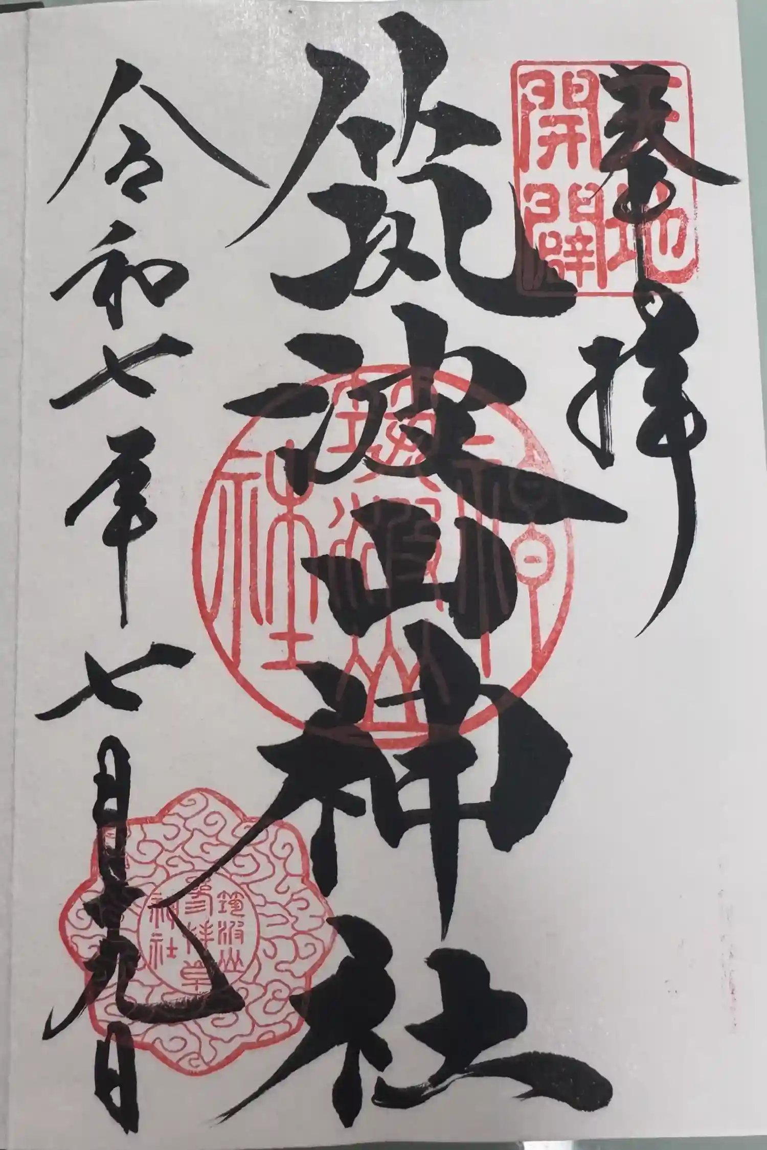 真ん中に筑波山神社と書かれ、右上に天地開闢(てんちかいびゃく)の印、真ん中に筑波山神社の印、左下に印が押されています。