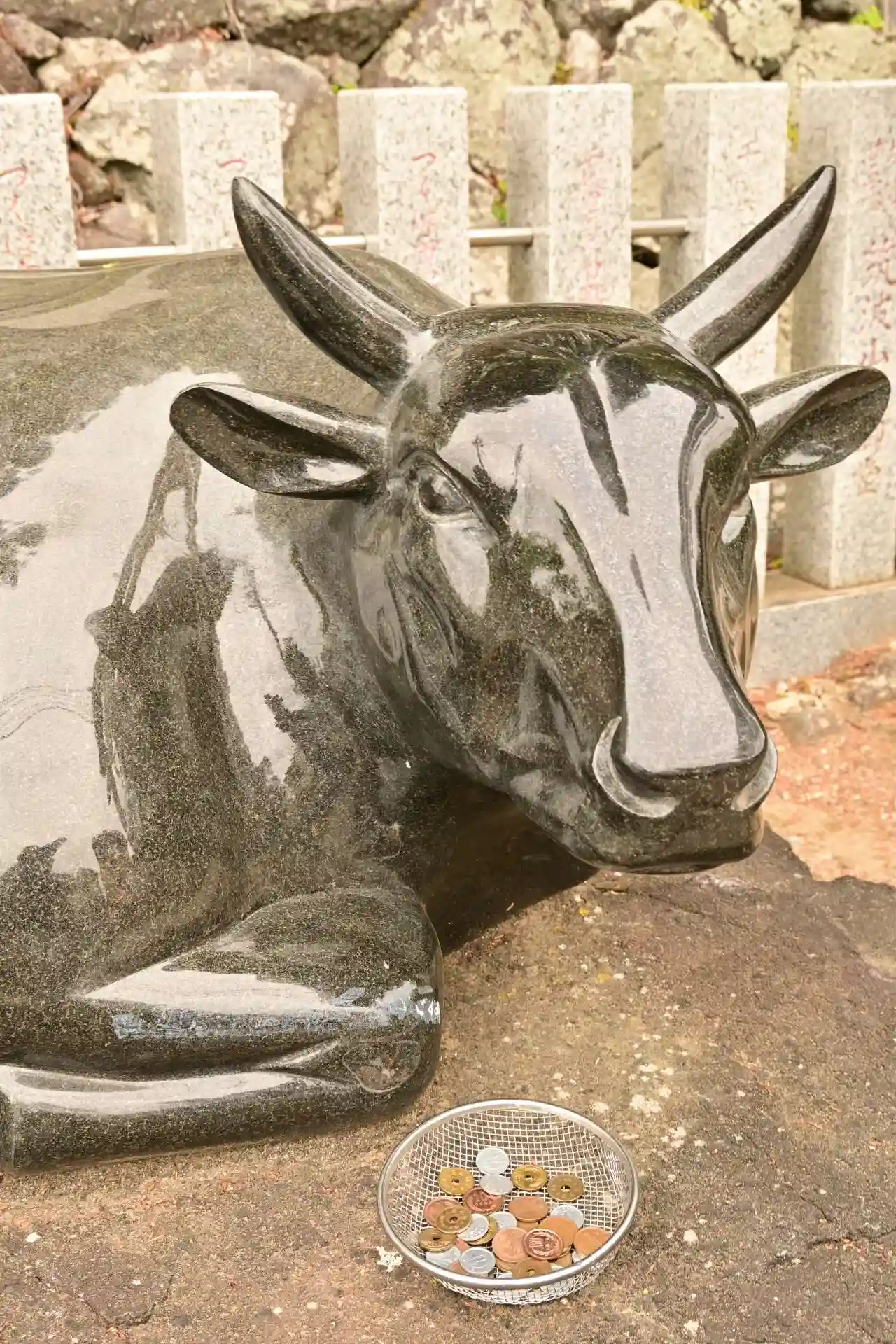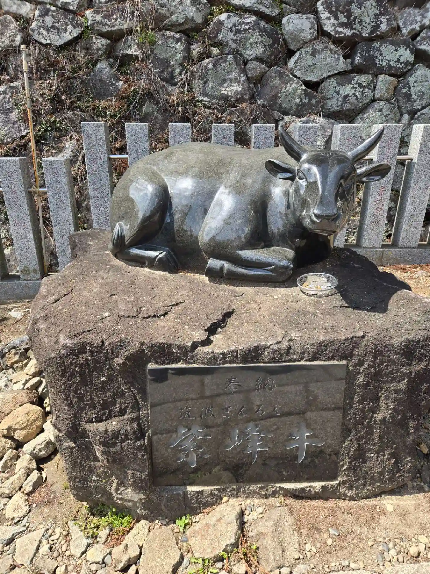 神社入口の牛さんもマスク